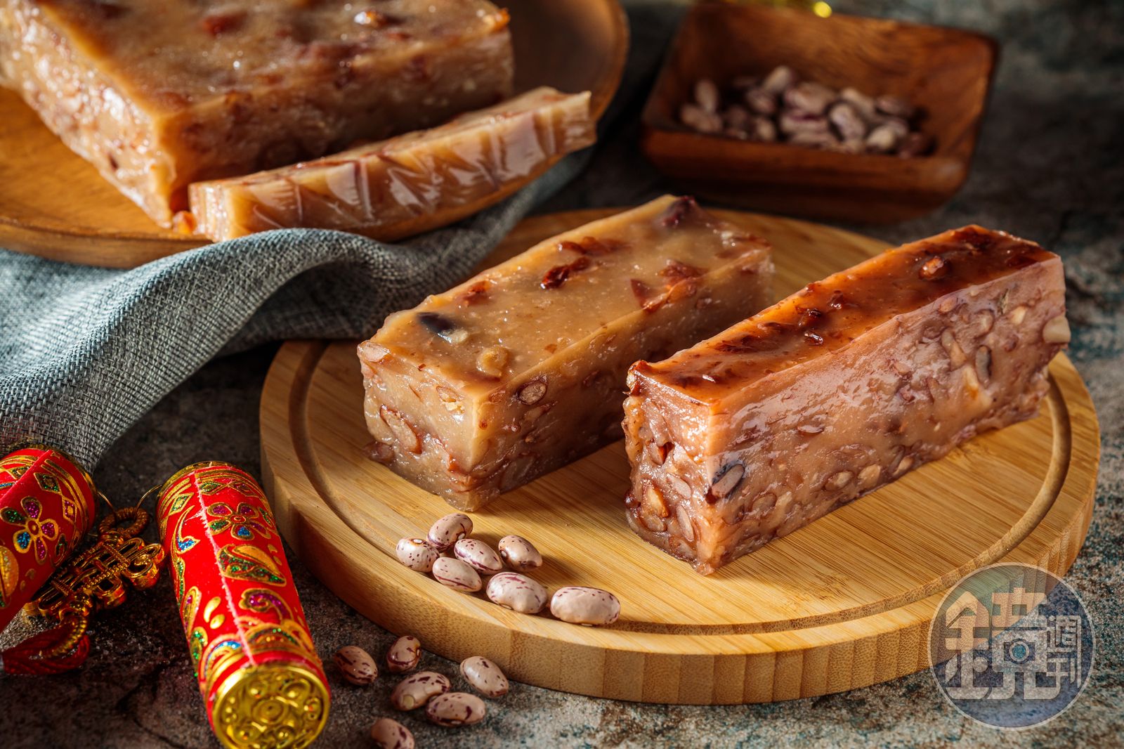 全年都吃得到的「招牌大豆年糕」,循著老一輩的傳統作法,大豆先浸泡再滾煮,用糖水蜜漬入味的同時,將泡一晚的圓糯米磨漿、瀝水變成「粿粹」,接著取一小塊粿粹煮熟變成「粿婆」,再摻回原本的糯米糰一起揉製,老闆娘吳榮美說這樣年糕口感才會Q,最後將大豆、糯米糰拌勻再蒸3小時。
