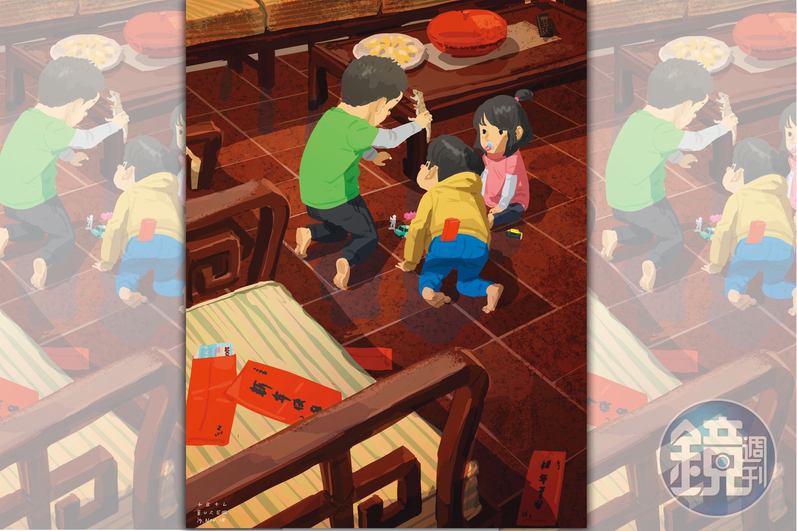 回老家過年,三個小朋友拿到紅包就把它們丟在一旁。
