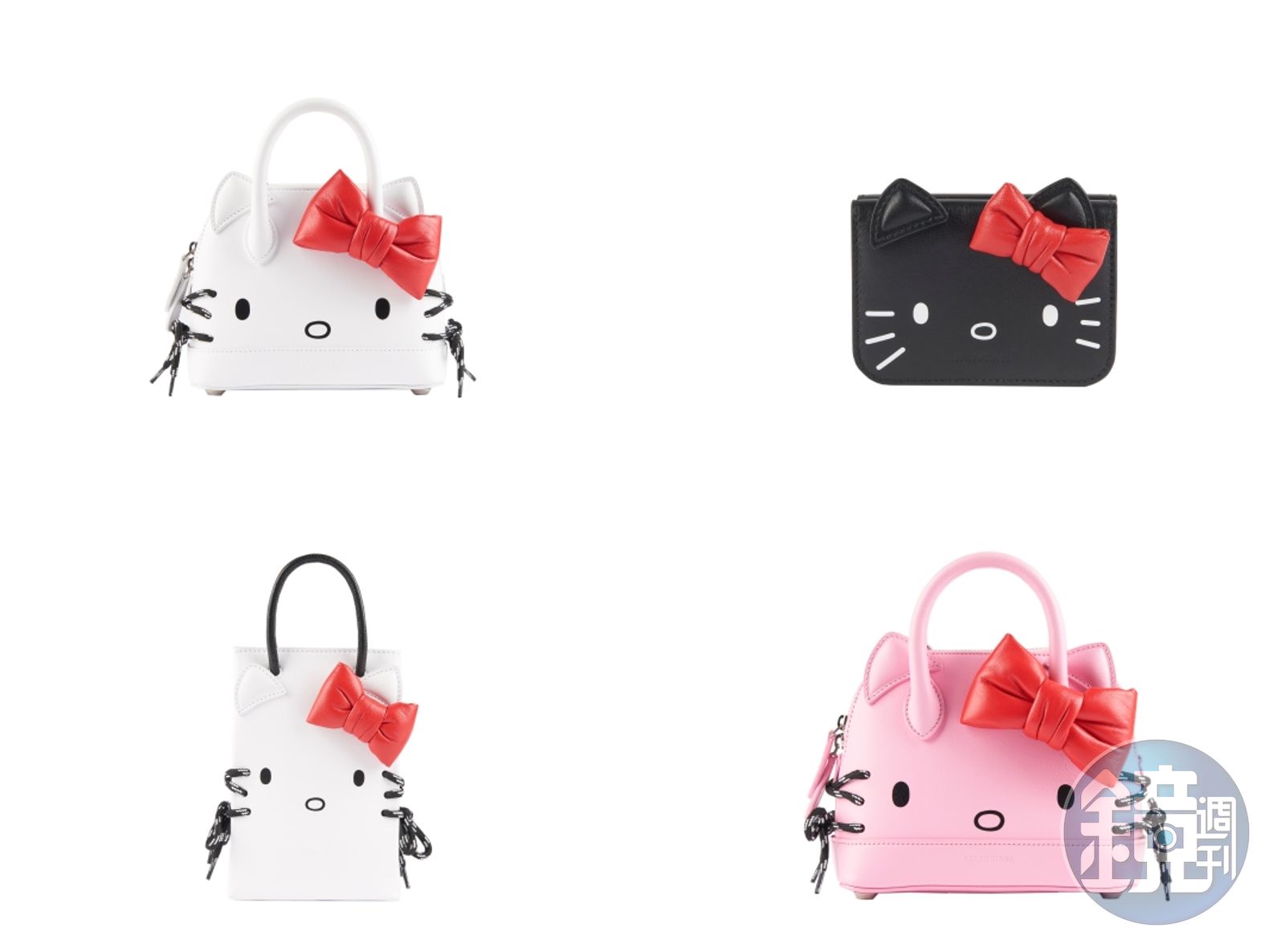 BALENCIAGA HELLO KITTY系列成員眾多,包括手機包、XXS號手提袋、XS號相機包以及XXS號、小號、及中號的Top Handle手提包、迷你錢包;包款顏色則分別有白色、粉色、黑色,每個HELLO KITTY包款的頂部都裝飾著一個紅色的皮製蝴蝶結。