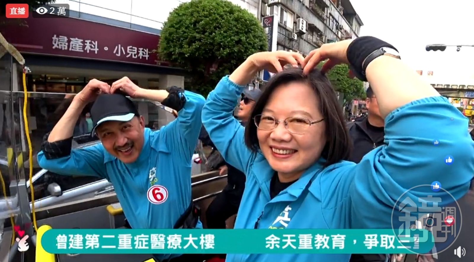 今(10日)民進黨新北市第三選區(三重)立法委員余天和總統蔡英文合體掃街。(翻攝臉書)發布時間:2020.01.10 18:16 臺北時間