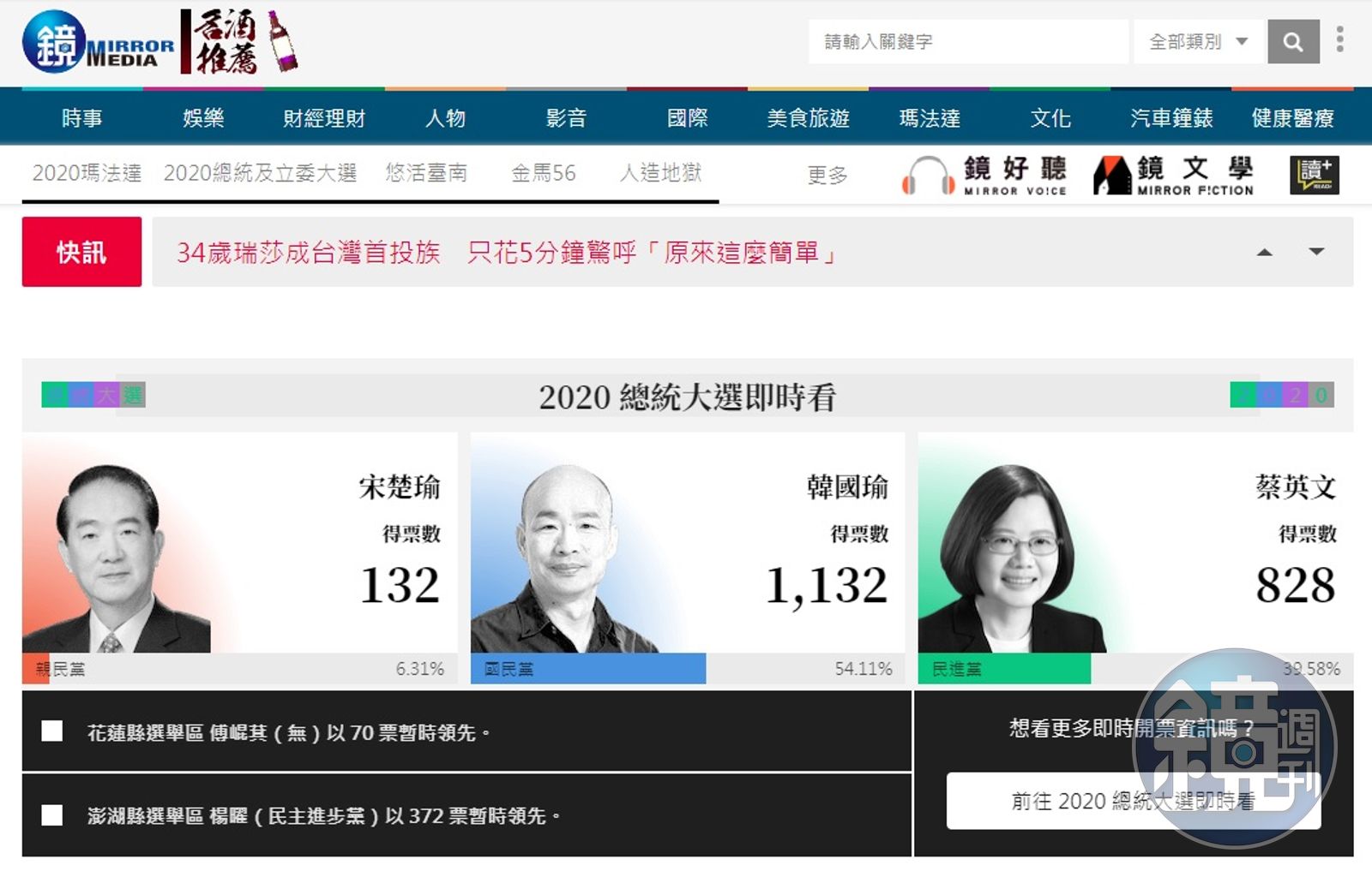 儘管各家媒體及在下午4點開票時間開始不久後,就有數據秀出,不過所有最終數據仍以中選會公布為主,在稍早中選會公布第一筆數據中,國民黨總統候選人韓國瑜以1,132票,暫時領先爭取連任的民進黨總統候選人蔡英文的828票,不過由於各地開票時間不一,所以最終數據仍以中選會公布為主。