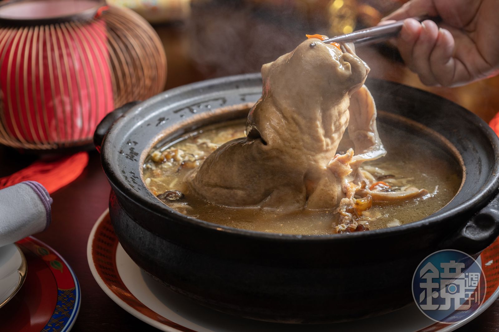 「像是『一品寶鍋』使用的上湯,是用雞、豬、牛烤過熬成,再來以金華火腿與整隻古早雞和正黑豬前後腿肉一起熬的二湯,雞湯則是所有炒菜的底,山海樓一個月光是拿來熬湯的雞就4、500公斤。」蔡瑞郎說。將雞塞入豬肚後縫合以二湯燉煮,一整鍋鮮香濃醇、勾人續碗,