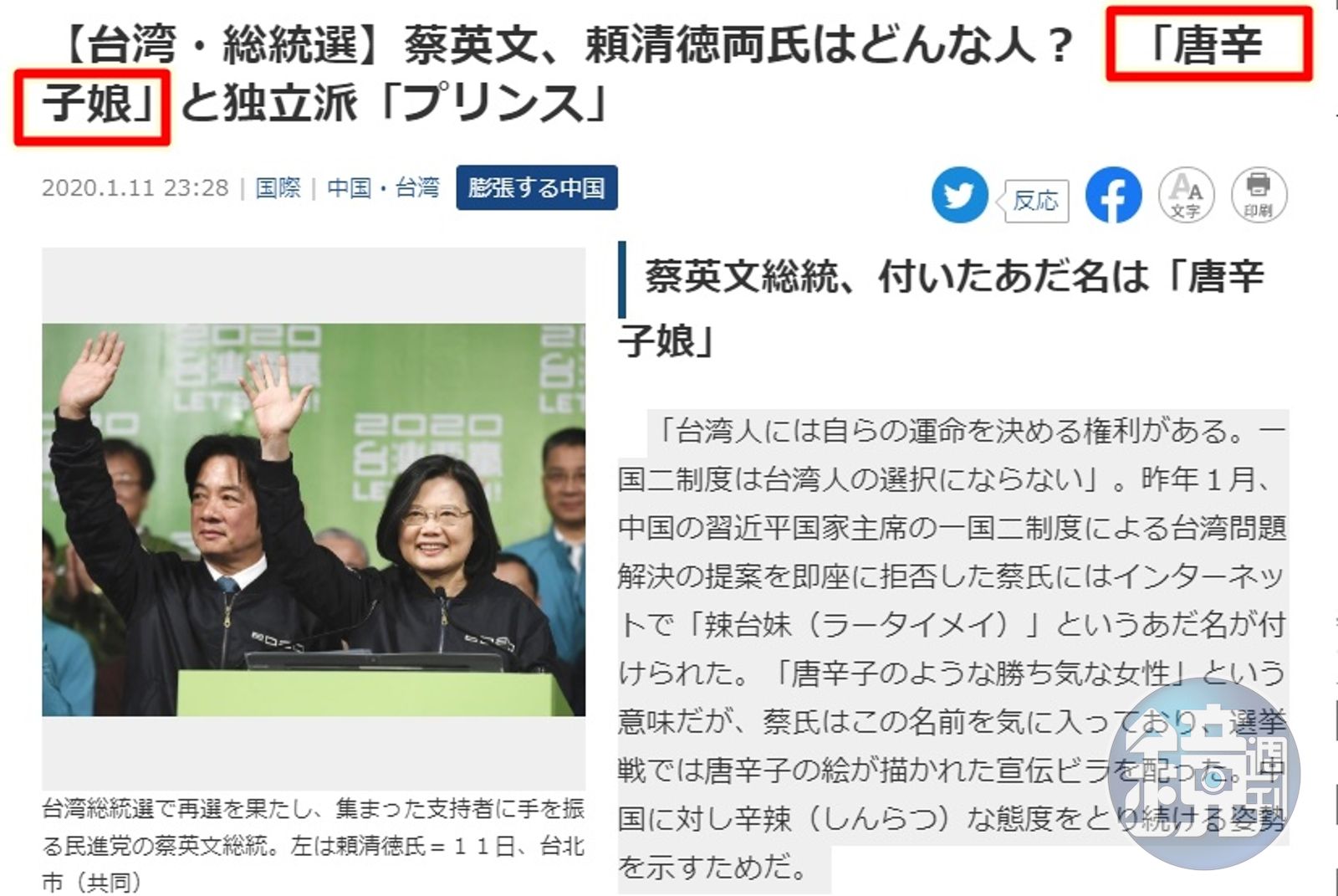 1月11日晚間,總統大選結果大抵揭曉後,日媒《產經新聞》以專文介紹總統與副總統當選人背景蔡英文與賴清德背景,指出去年1月,蔡英文在社群媒體上拒絕了中國習近平的一國兩制方案,讓蔡英文獲得了「辣台妹」的稱號,展現出對中國嗆辣的態度。