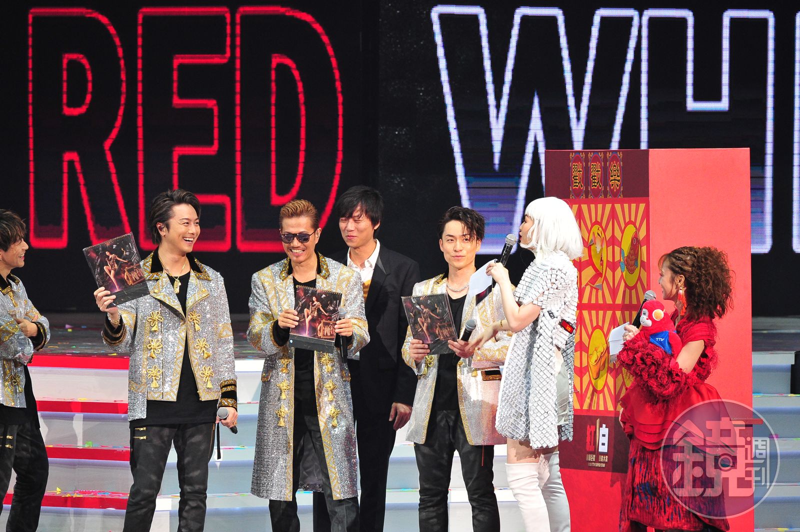 放浪兄弟EXILE最後在舞台上秀出各自寫好的春聯,一人一字念出「金豬搖尾辭舊歲,玉鼠探頭迎新春」,並由AKIRA祝福大家「吉祥如意」。