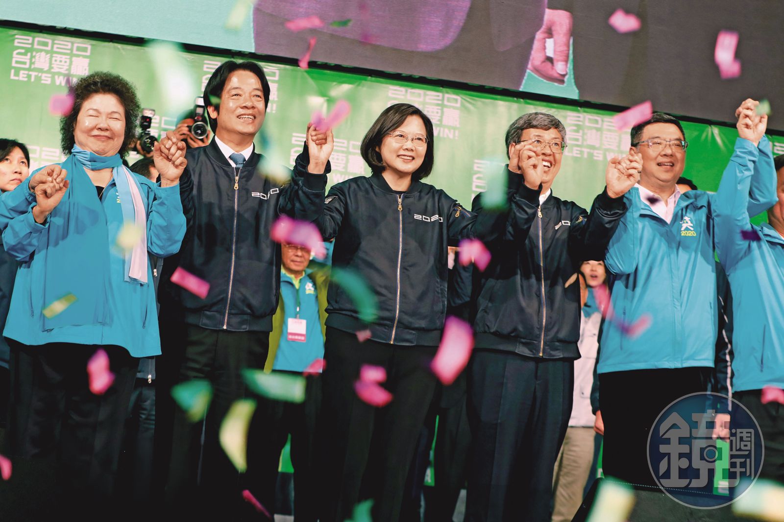 民進黨總統參選人蔡英文獲得57.1%得票率,囊括817萬餘票,完全壓過國民黨對手韓國瑜38.6%、552萬餘票,成功贏得連任,國會席次綠營也單獨拿下61席,加上不含時代力量的友軍4席,取得穩定過半的65席,再次實現完全執政。