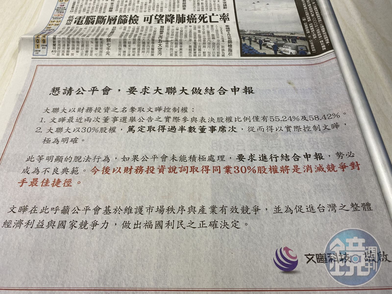 公平會今天針對大聯大收購文曄3成股權案做出決議表示,依照現有事證及大聯大公司財務性投資等說明,尚不需向公平會申報結合。對此,文曄公司則回應表示,目前已委請律師研議所有相關法律議題。文曄指出,至少可確認公平會已要求大聯大未來任何時間(不限本屆董事任期)欲參選文曄公司董事、召開股東會、徵求委託書、增加持股,都必須事前向公平會再行請釋或提出結合申報。