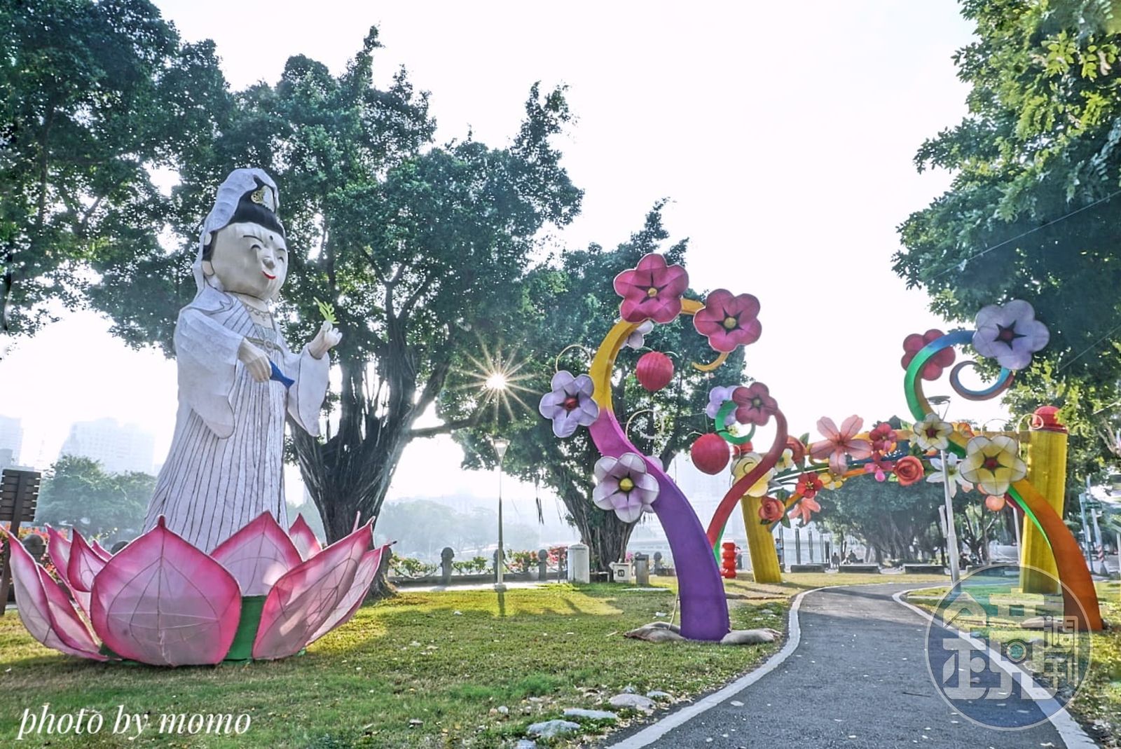 此區燈飾包含站在蓮花座的觀世音菩薩與小和尚,沿路步道兩側更有許多燈飾點綴。(Mo Ron Chan授權提供)隨著農曆新年逐漸到來,緊接著還有元宵燈節,全台各地縣市都有舉辦大小不等的燈會,其中去年高雄舉辦的「愛河燈會金銀河」想必讓全台網友都印象深刻,當時燈會入口處設置了數座蓮花燈柱,就被外界揶揄像是「喪事」會場。