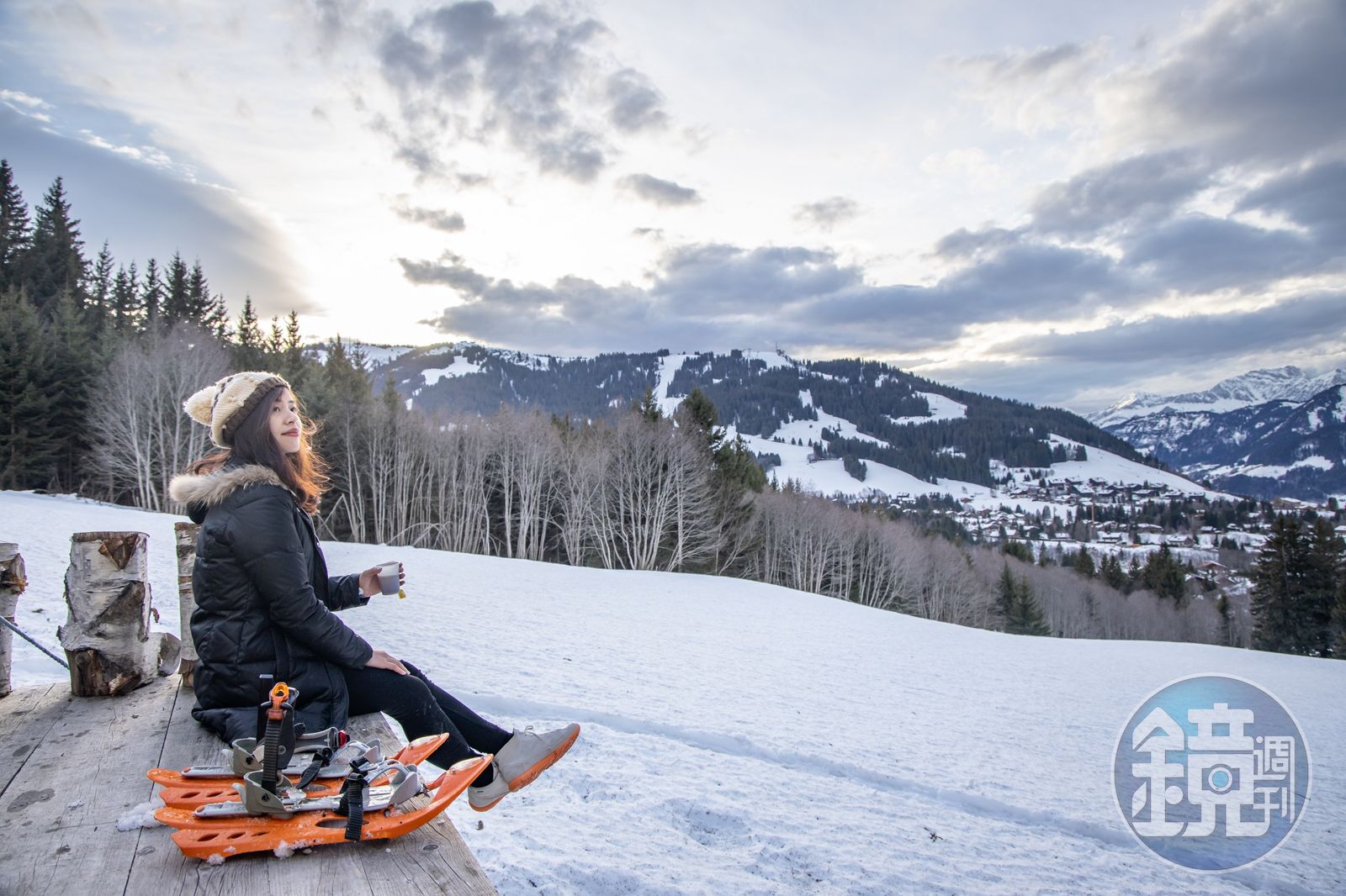 終於,來到休息的蒙古包,大家放下裝備,設置在樹林旁的蒙古包裡,壁爐早已燃起熊熊烈火,工作人員準備好飲料與甜點。手握一杯熱茶,開心地坐在戶外平台,眺望來時路,四周是白皚皚的雪山連峰,樹林之外的村落、可愛木屋,眼前風景美麗像是童話裡的世界。休息過後,大家開心地踏上歸途,也把眼前景致深深刻劃在腦海中。