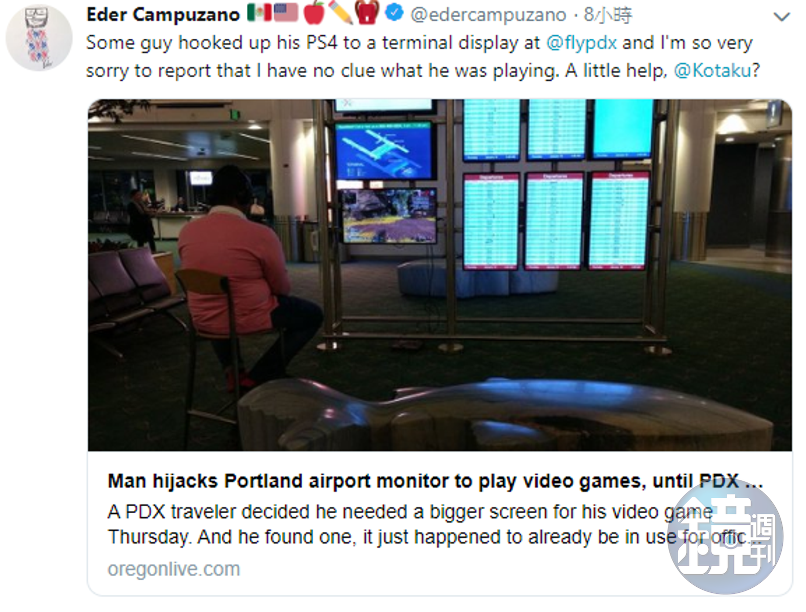 事情發生在美國波特蘭國際機場,16日凌晨有位年輕旅客在等待航班時,竟然直接在機場等候區把PS4主機接上機場的航班螢幕,大辣辣地開玩知名射擊遊戲《Apex英雄》。