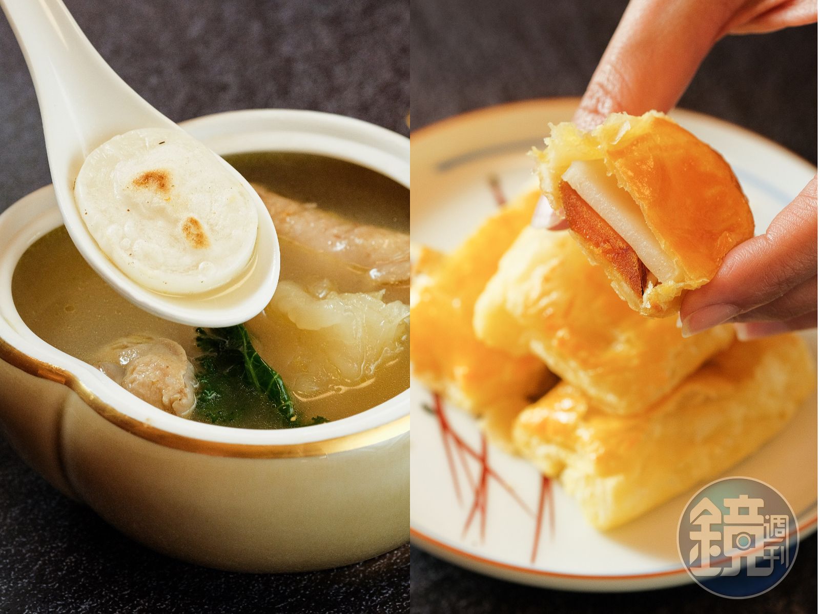 帶回新鮮的年糕,許心怡捨棄以前加臘肉、青菜炒的方法,而是立即切片烙烤,至邊緣焦黃中心微膨,類似日本喝紅豆湯搭配的烤麻糬,不過她搭配的是溫潤甘醇、膠原滿點的花膠雞湯。年糕帶來飽足感,又不會破壞原本的湯頭,「隔天要再利用那鍋湯都可以。」