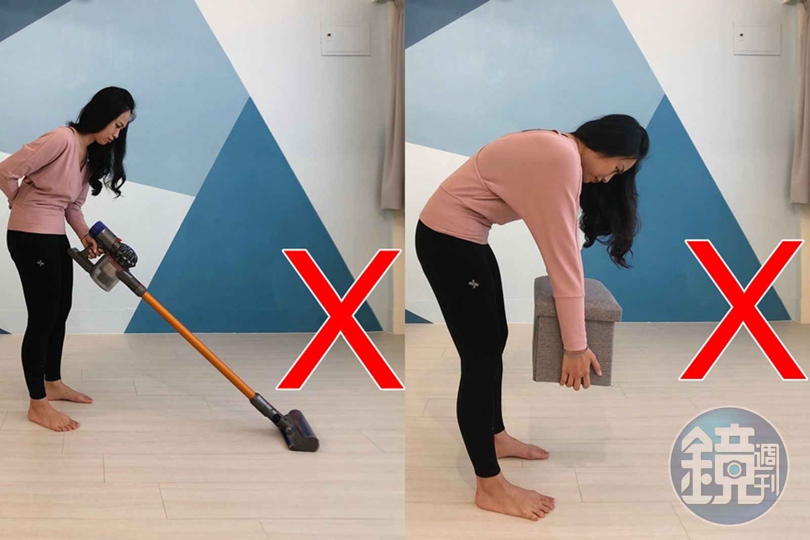 清潔地面NG動作:掃地或拖地時容易彎腰駝背及聳肩,導致身體過度傾斜來清潔較遠的地面。(CHA 帶瑜去旅行提供)CHA CHA老師提醒,中年或年長的朋友可考慮穿戴護腰來增強腰間肌肉的支持,若物品太重切勿逞強,應尋求他人協助搬運。