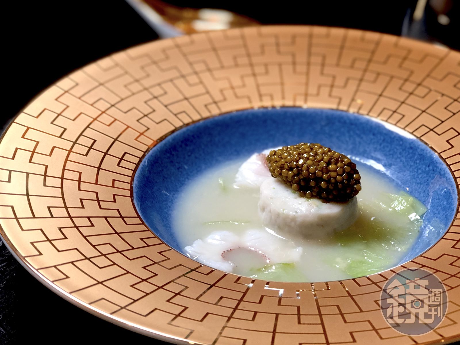 遇強則強,好比他們想為蜆蚧醬猛爆衝擊的味型添一些雅致,譚師傅立刻走進廚房做了米湯,而廣東人吃鯪魚球總會搭上蜆蚧醬,因此他們將加了香菜、陳皮的魚球取代傳統版本的雞肉,芬芳馨香與米粥呼應。此時又覺得少了點鹹鮮,經張聰建議,譚師傅疊上一勺矜貴的魚子醬,畫龍點睛。