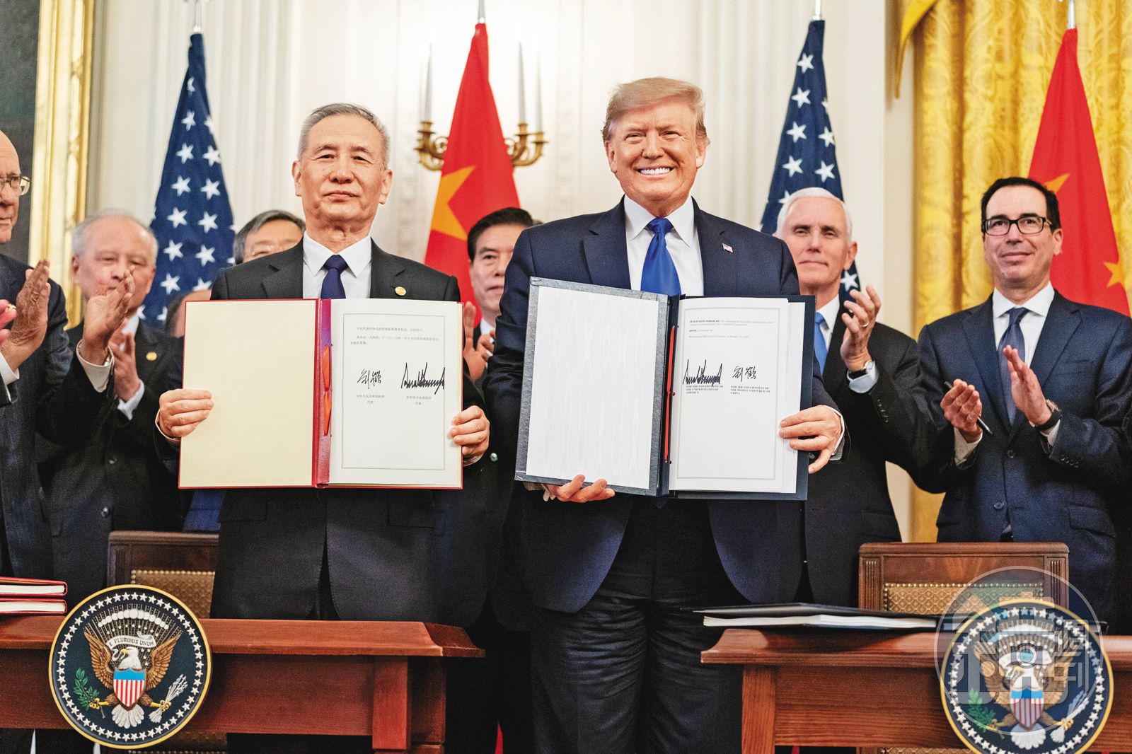 川普與劉鶴在華盛頓簽署了第一階段貿易協定,川普大肆宣揚協議的成績,至於大陸則低頭暗吞苦果。(WhiteHouse Flickr)