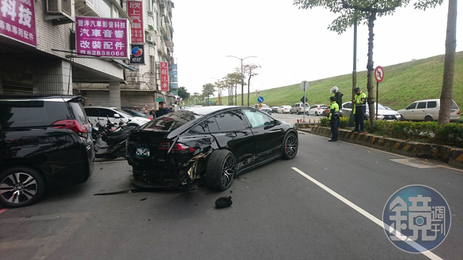 警方調查,梁姓男子(37歲)是在19日上午10時許,開車由環堤大道往蘆洲方向行駛,許姓男子則是由永樂街38巷45弄口開出,準備左轉環堤大道往三重方向行駛,隨後,梁男所駕駛的特斯拉轎車疑因超速,和未讓幹道車先行的許男(42歲)所駕銀色車發生車頭撞擊,許男車子停下,特斯拉卻因巨大衝擊力造成後車廂彈起,再橫掃到分隔島後逆向落下,車輛後保險及輪胎也脫落。