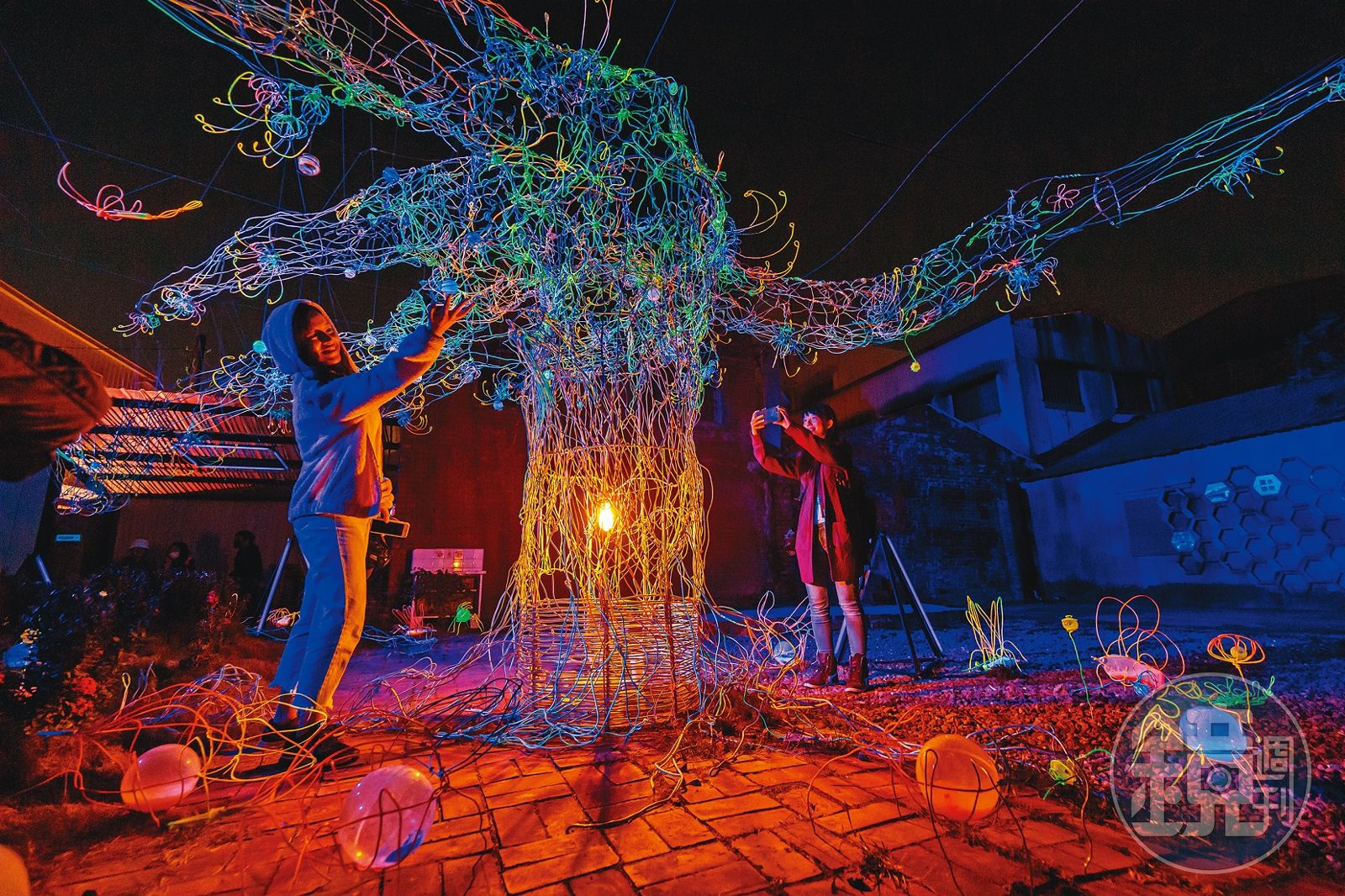 天色漸暗,小小一條巷子泛起異樣藍光,天上飛舞的各式光蟲,引領遊客走進一間老屋,眼前景象彷彿來到電影《阿凡達》的異想世界,正中央一棵發光樹,多彩的螢光線條交織出生命的成長,這是辛綺╳艸非火創作的《成長是一顆流光樹》,樹根是過去、枝幹是現在、末梢的花朵與果實是未來。