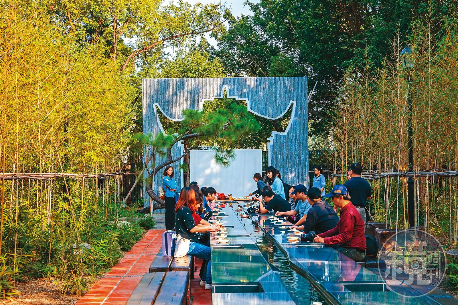 一旁還有以南明時期文人沈光文為名的「沈園」,善化人一定知道這位「台灣孔子」。目前沈園僅對預約團體開放茶席,以石頭、竹子打造的庭園裡,仿照古代文人雅士的飲酒詠詩遊戲,打造出「流觴曲水」,將一杯杯斟滿茶的茶杯置於盤上,順著流水而動,到了自己面前即可拿起品茗:流水盡頭掛有數枝大毛筆,沾水即可在地上寫字,雖無書法家王羲之為《蘭亭序》留下的「天下第一行書」,但也可藉此沾染昔日文人的詩情雅興。