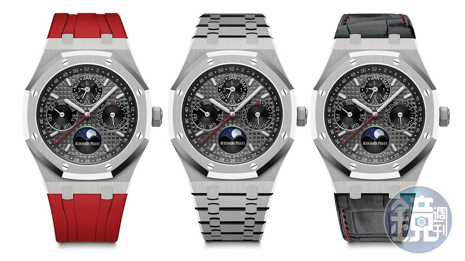 皇家橡樹萬年曆中國限量版以中國人喜愛的紅色為主調,在週曆指針的部分以紅色點綴,鈦金屬材質的錶殼和鍊帶,還另外附加紅色橡膠帶、以及紅色縫線的皮錶帶。這款特別版41mm的錶徑是現行皇家橡樹萬年曆款的尺寸,這是從2012年愛彼在皇家橡樹40周年紀念之後做的調整,因為早期皇家橡樹推出的年代,還沒有那麼流行大錶徑,所以當時尺寸都不到40mm,後來做了錶徑加大的修改之後,才換上5134自動上鍊機芯。