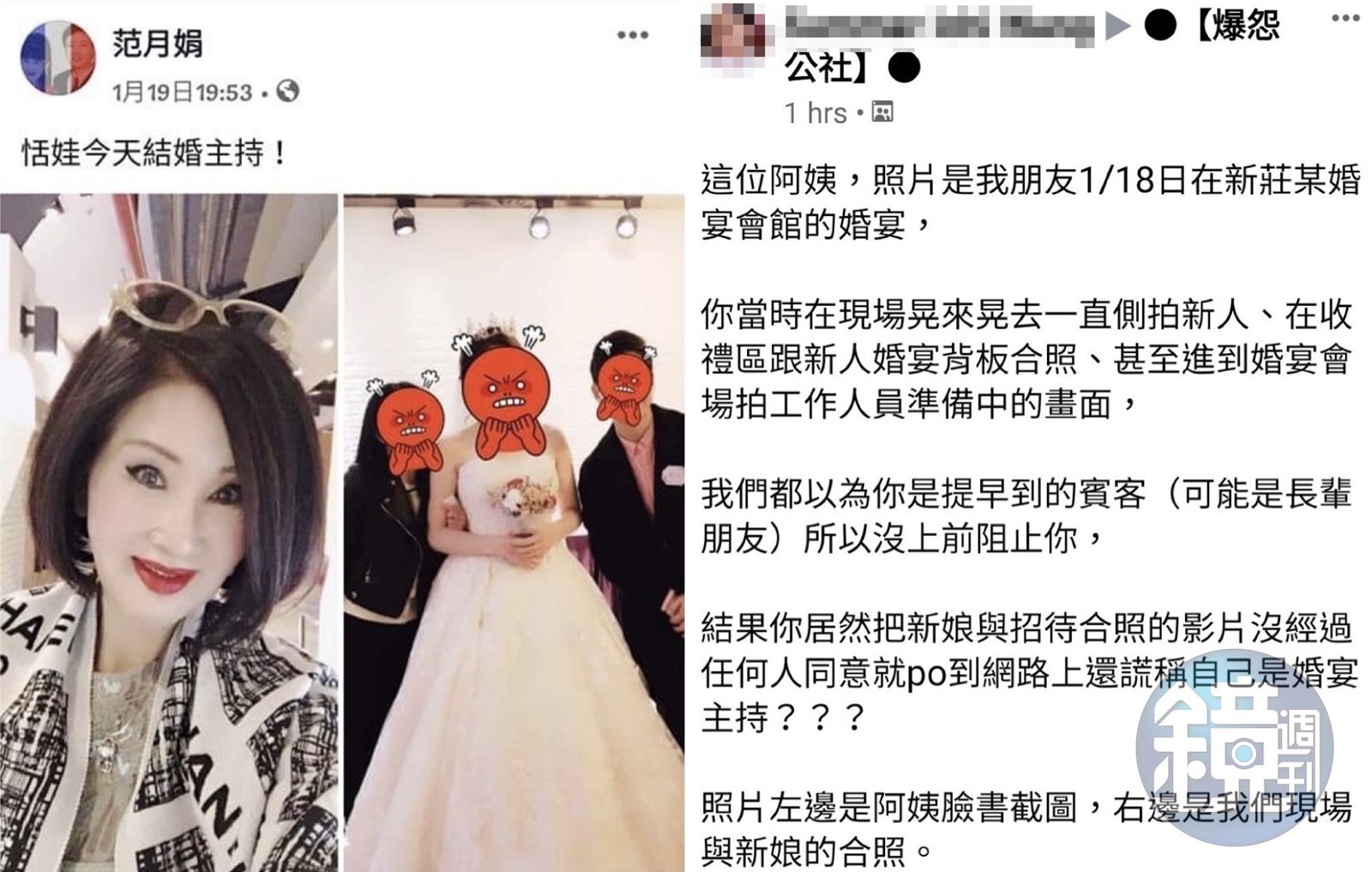 資深藝人「恬娃」范月娟向來喜歡到處蹭人氣、刷存在感,在演藝圈眾人皆知,圈內藝人婚喪喜慶經常出現她的身影。但近日有網友爆料,在朋友的婚宴上巧遇恬娃,原以為她是新人家中長輩的朋友,後來發現根本不是,更誇張的是,事後恬娃還在自己臉書上自稱是婚禮主持,讓該網友氣炸在臉書直嗆「你哪來的自信!」