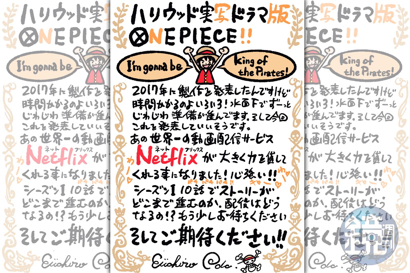 身為漫畫原著作者與真人版影集監製的尾田榮一郎,特別宣布這項消息,「我明白自己早在 2017 年就宣布了製作這部戲,但籌備需要花時間。幕後的準備工作進展雖然緩慢,卻一直在進行。看來我終於能夠宣布這個大消息:Netflix,全球首屈一指的串流娛樂服務事業,將給予我們極大的製作支援!這帶給我們極大的鼓舞!這個故事在第 1 季的 10 集當中會進展到何種程度?我們要邀請誰來演出?敬請拭目以待!」