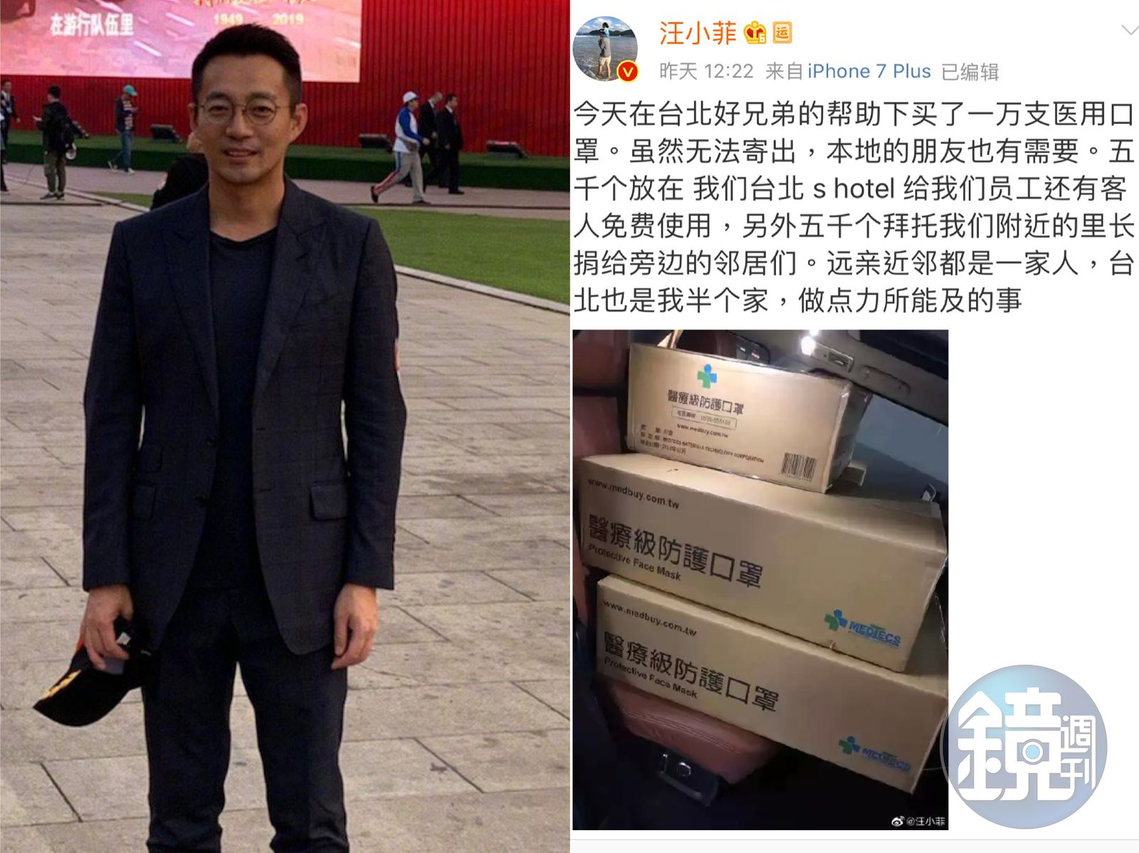 日前汪小菲才在微博曝光大S在日本買到1萬個口罩,託人寄往武漢捐贈掀起網路論戰,事隔幾日,汪小菲也在微博、微信朋友圈及臉書透露:「今天在台北好兄弟的幫助下買了一萬支醫用口罩。雖然無法寄出,本地的朋友也有需要。5,000個放在我們台北s hotel 給我們員工還有客人免費使用,另外5,000個拜托我們附近的里長捐給旁邊的鄰居們。遠親近鄰都是一家人,台北也是我半個家,做點力所能及的事。」
