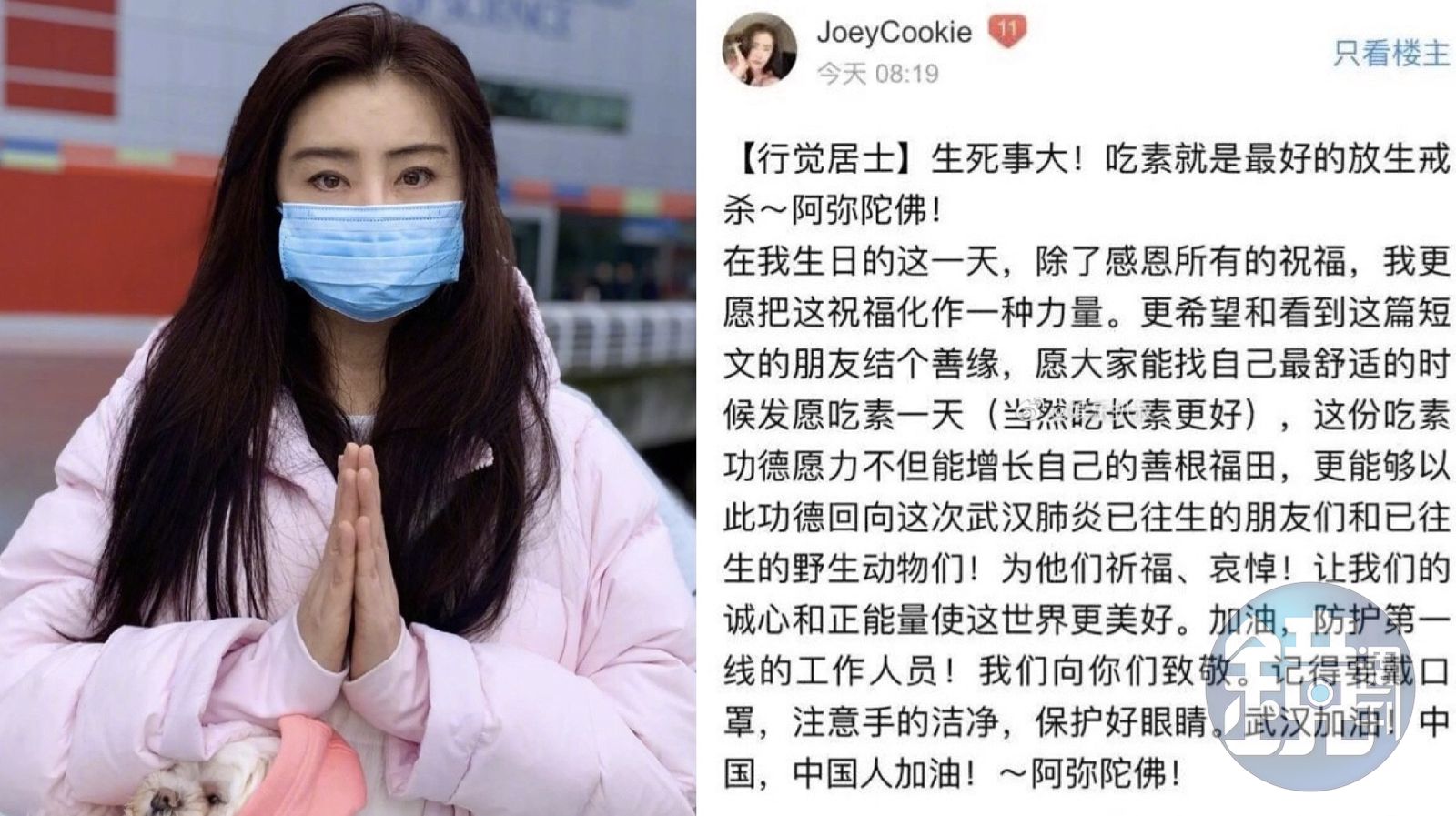 圖片中身穿粉色羽絨服王祖賢,長髮披肩,懷裡還背著愛犬,雖然戴上口罩仍不失當年巨星風采。照片裡王祖賢不忘揮手,向自己的粉絲們問好。 而在另一張照片中長年信佛的王祖賢雙手合十,為武漢的疫情祈禱,雖然久居國外多年,面對這波疫情來得又快又猛,經常關心華人世界的她,時刻關心著疫情,並用實際行動來支持武漢。 即便今天是王祖賢的53歲生日,她依舊戴上了口罩,以身作則呼籲粉絲們共同關注疫情發展,並呼籲大家能發願吃素一天,為往生者及野生動物祈福。