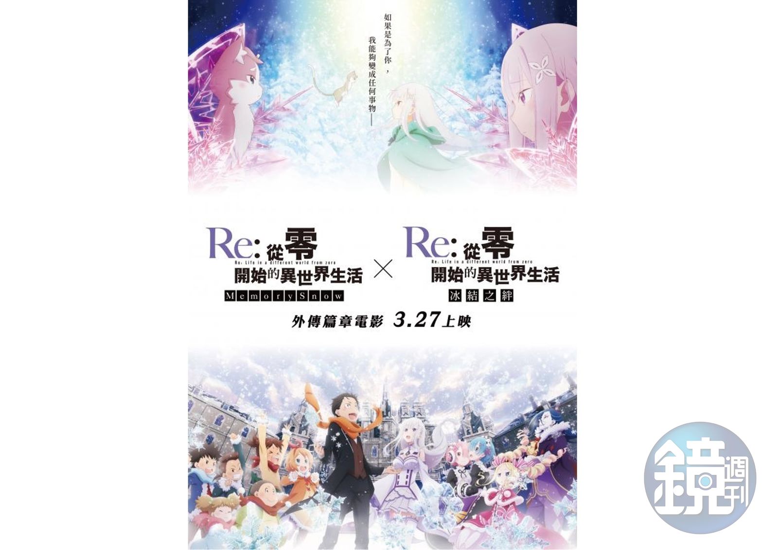 改編自同名輕小說,2016 年推出電視動畫的《Re: 從零開始的異世界生活》,一上架就深受動漫迷喜愛,女主角到底是 EMT 愛蜜莉雅,還是股價制霸全作的雷姆,始終是粉絲好鬥之題。動畫完結後分別在 2018 和 2019 年推出新作 OVA,台灣方面宣布在今年 3 月一口氣上映 2 作 OVA,合併為一部《Re: 從零開始的異世界生活 外傳篇章電影》。