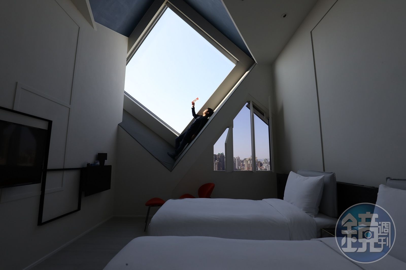 眾多設計客房中,以有方型觀星窗的「星光客房」最受旅客喜愛,入住其中,能將台中的天空隨時看入眼底。
