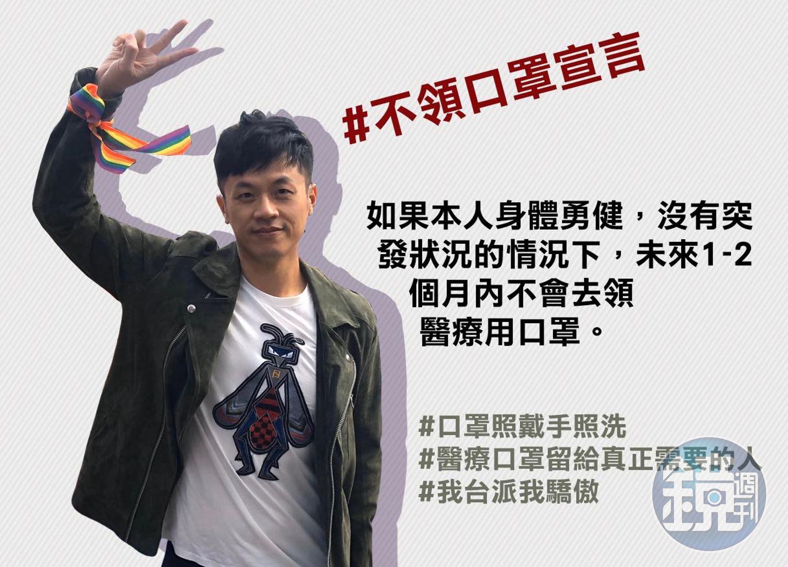 焦糖哥哥表示:「除了醫師說有戴口罩必要的人,真心建議其他人不要去排隊搶買口罩。」除非本身生病(呼吸道疾病)及出入醫院的人需要戴醫療用口罩之外,健康的人不要自己嚇自己,他認為目前台灣確診10例,且都被政府隔離治療中,0人因武漢肺炎死亡,其中1例也完全康復了,「不要把口罩當黑糖珍奶買一送一排隊。」
