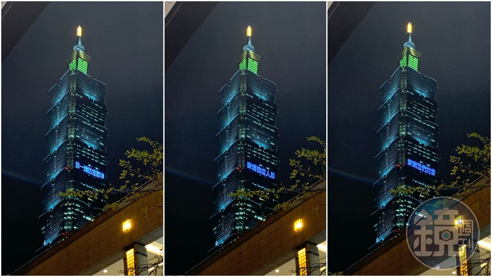 台北101點燈致敬第一線防疫人員。(讀者提供)為防止武漢肺炎在台疫情擴大,第一線防疫人員努力不懈,中央指揮中心指揮官、衛福部長陳時中昨日在記者會因為心疼同仁而一度哽咽,讓不少國人看了相當不捨。