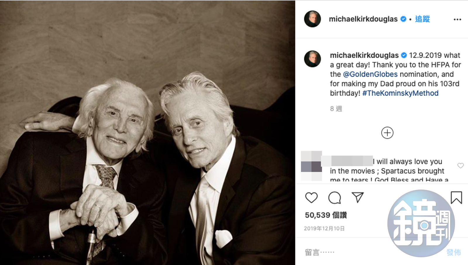 這項消息是麥克道格拉斯所發布,寇克去年12月生日時還跟兒子、女婿一起在家庭聚會上露臉。麥克道格拉斯以影集《好萊塢教父》二度入圍金球獎時,他特別發文表示,願意把這項榮耀送給父親當生日禮物。