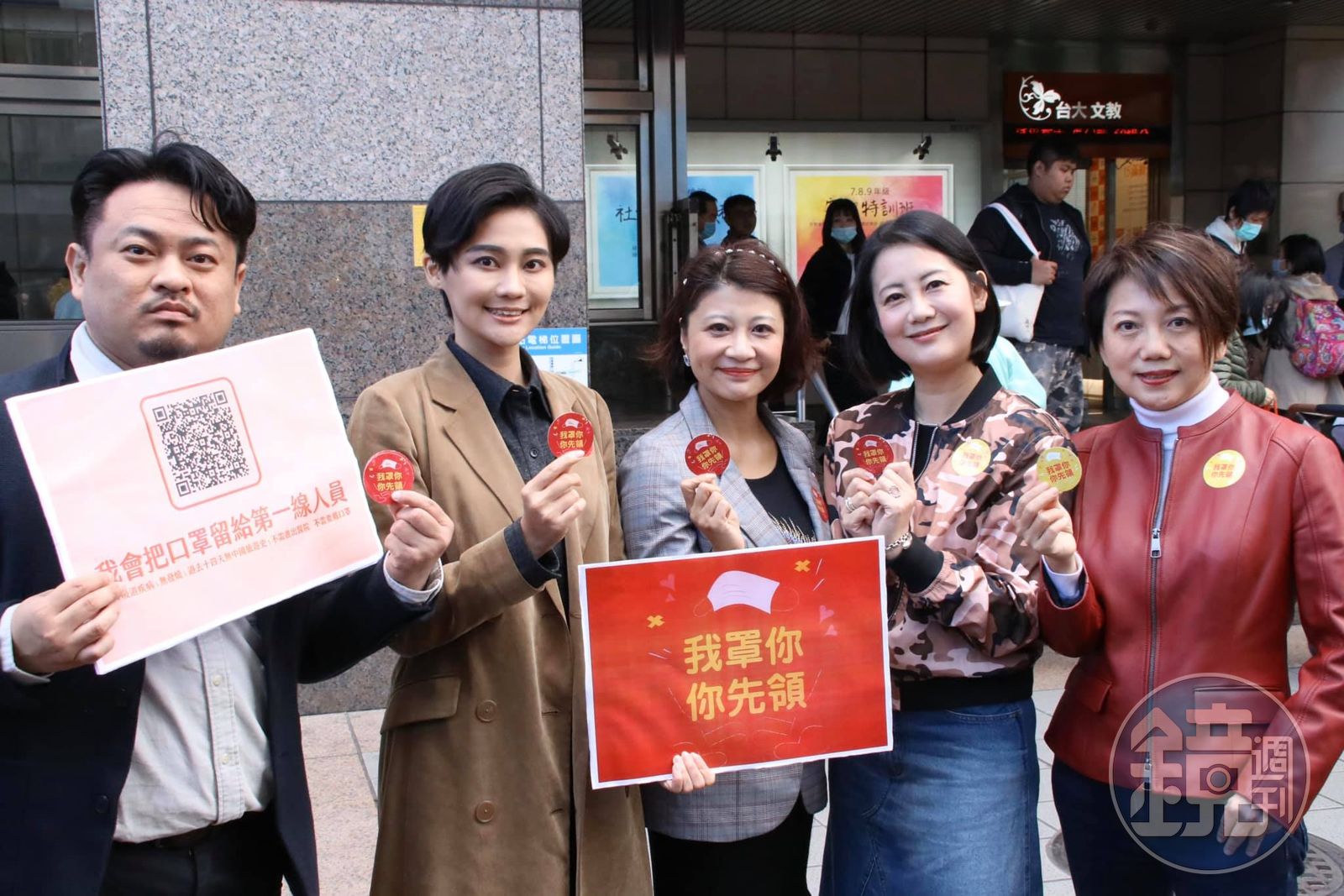 今(6日)是健保藥局實名制販售口罩的第1天,民進黨立委林楚茵、吳思瑤、賴品妤、洪申翰、范雲今早到台北車站捷運站出口發放「我罩你,你先領」貼紙,呼籲民眾將口罩留給需要的人。林也呼籲常戴口罩的政治人物如前總統馬英九、高雄市長韓國瑜、台北市長柯文哲能聽專家的話,把口罩留給需要的人。