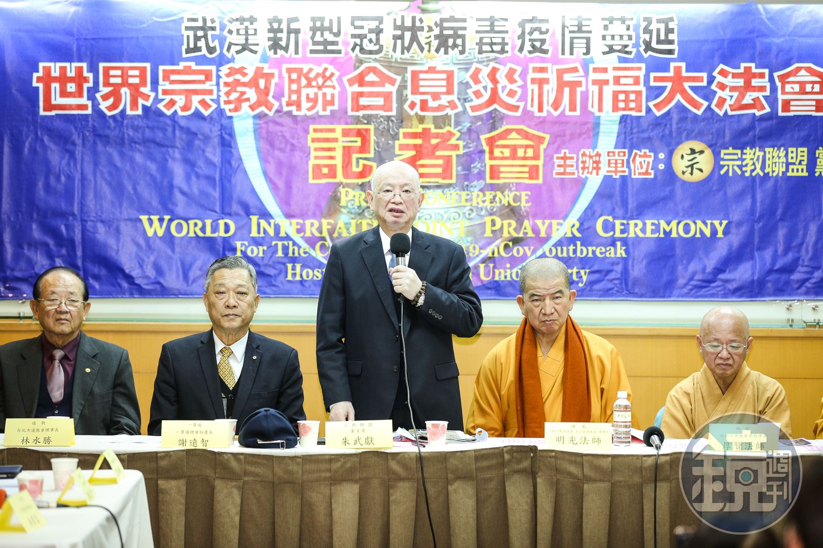 宗教聯盟黨主席朱武獻在記者會中指出,武漢新型冠狀病毒蔓延全球,台灣宗教聯盟號召全世界修行者以佛教儀式為主,各宗教儀式為輔,在統一時間,於世界處分別辦理《世界宗教聯合息災祈福大法會》,希望用全球宗教人士善良的慈悲心與大愛,祈佛菩薩、上帝、神、聖、仙佛光加持,化解全世界人類肺炎病毒災難於無形。
