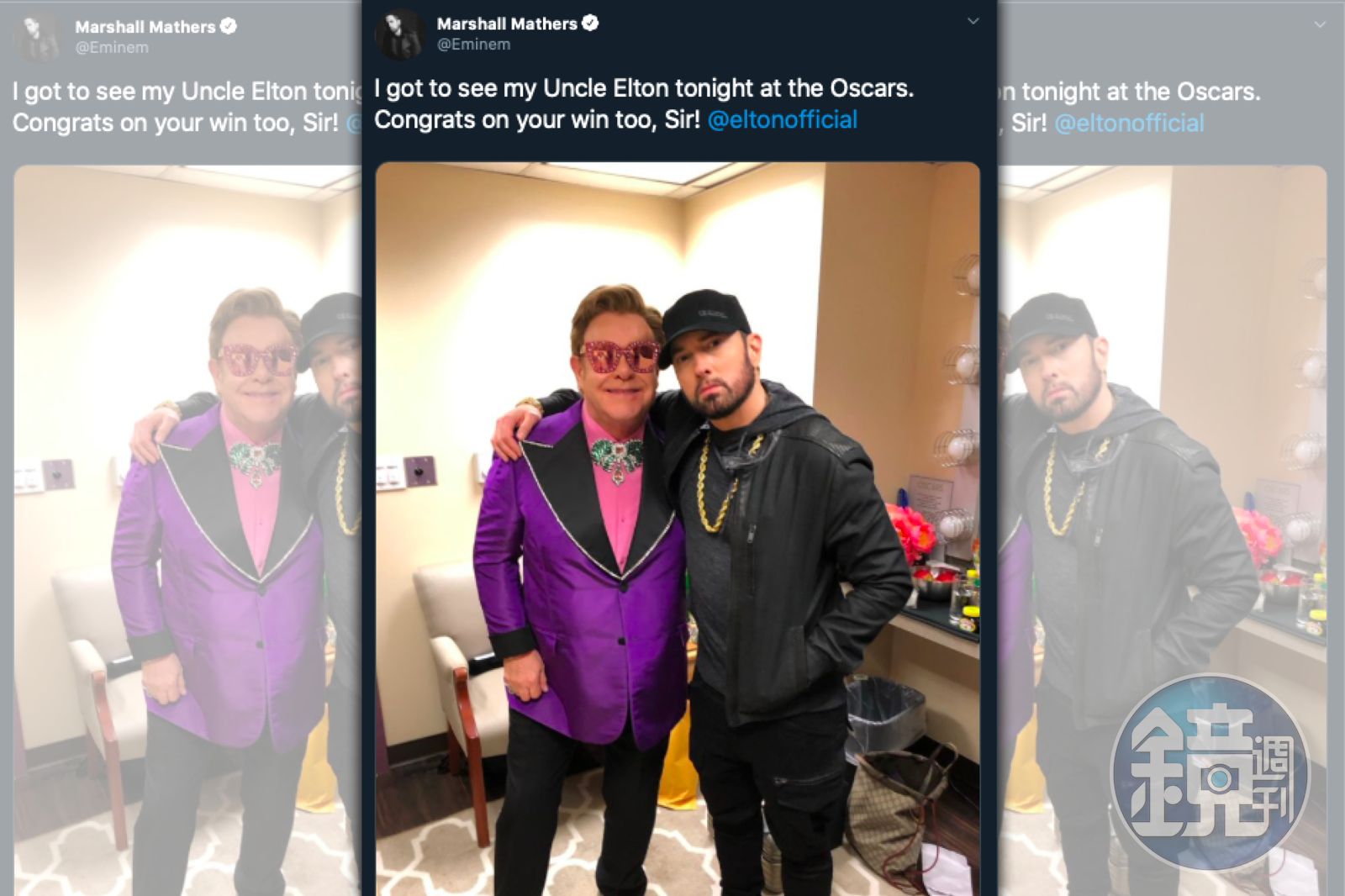 至於晚了18年才到奧斯卡舞台的阿姆,似乎並不在意大家的反應。他倒是很高興在推特發佈後台照片,原來是跟前輩艾爾頓強的合照,兩人當年在葛萊美獎合作後,就再也沒同台了。