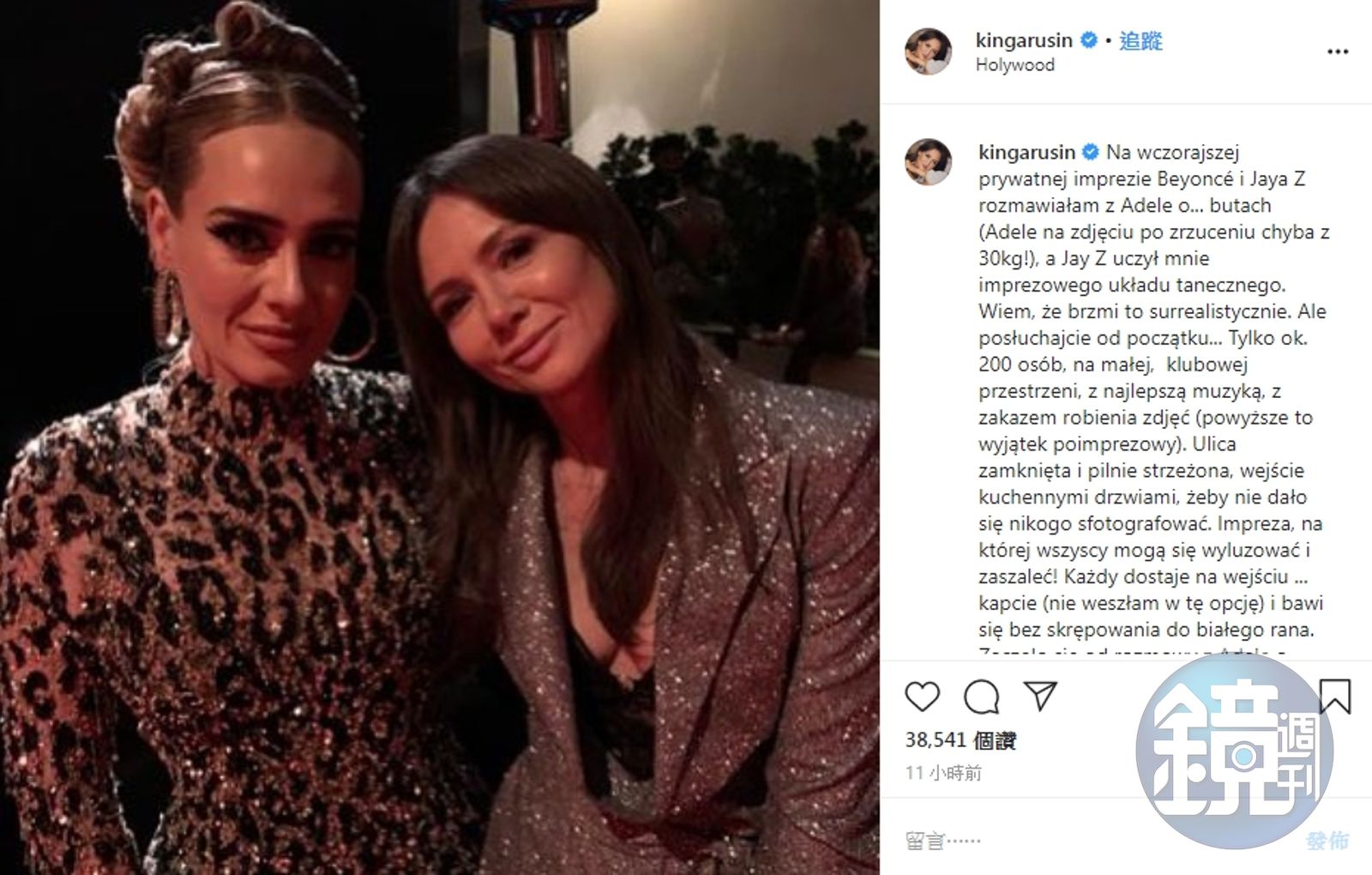 來自波蘭的電視節目主持人魯辛(Kinga Rusin)在Instagram上po出與愛黛兒的合照。雖然這個慶功趴是私人性質,禁止賓客拍照,但魯辛表示自己是個例外。同場出席的還有蕾哈娜、李奧納多狄卡皮歐、布萊德利庫柏等好萊塢巨星,她坦言自己一開始根本沒有認出愛黛兒,「因為她現在太瘦了!」