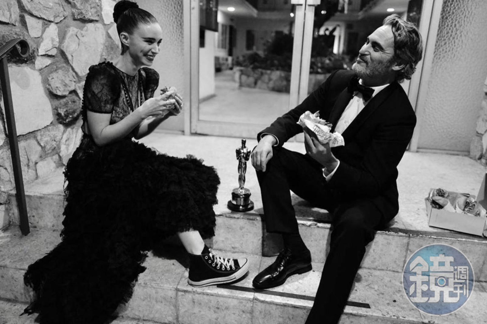 瓦昆菲尼克斯與女友魯尼瑪拉沒在會後派對喝香檳、吃美食,而是像一般普通情侶,坐在台階狂嗑漢堡,瓦昆笑得十分開心甜蜜,換上帆布鞋的魯妮則笑得有點羞澀,但兩人的眼中都充滿愛意。