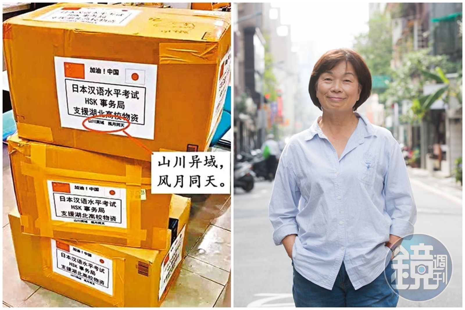 「山川異域,風月同天」這8個字,是盛唐時日本權臣長屋王贈給中國高僧大德袈裟上刺繡的字,後面還有「寄諸佛子,共結來緣。」是表達「山川有界,中、日兩國雖屬不同國度,然而風月無界,在災難面前大愛無疆。」