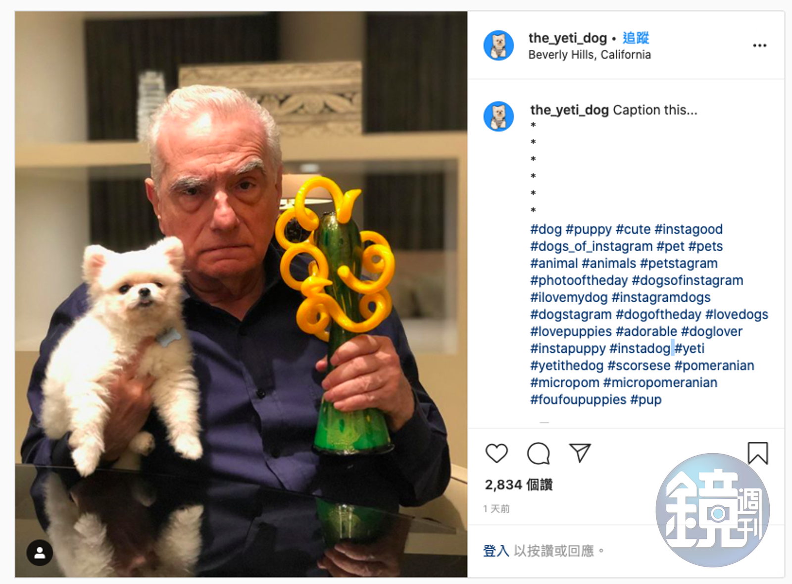 導演馬丁史科西斯,一手抱著愛犬「雪人」,一手拿著棕櫚泉影展的獎座,開放讓網友寫設計對白,儼然對奧斯卡槓龜有所不滿。(翻攝the yeti dog官方Instagram)發布時間:2020.02.12 15:31 臺北時間