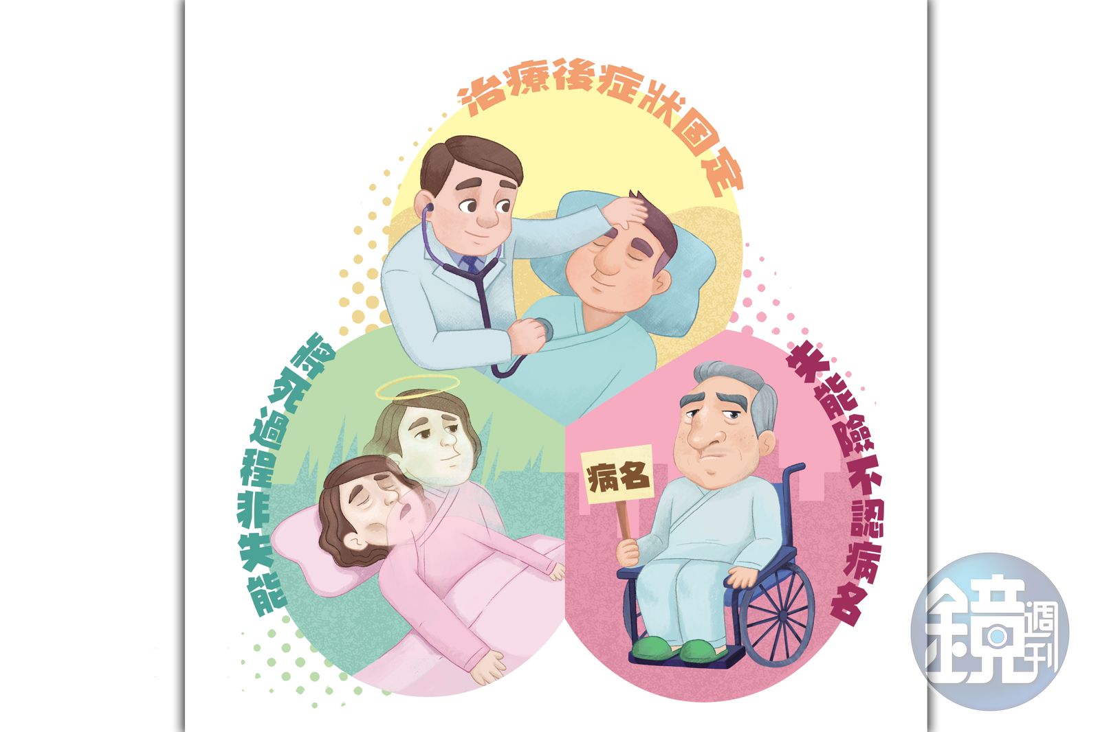 金評中心表示,積極治療期並不合乎失能規定,且案例體況不屬於症狀固定,無論任何人、任何原因在死亡前,都會有短暫符合一級失能的期間。賴柏翰表示,之前有幾起案例,是被保險人還在住院中就取得診斷證明書,然後很快往生,這其實算是「治療中」,而非條款要求的「治療後」。
