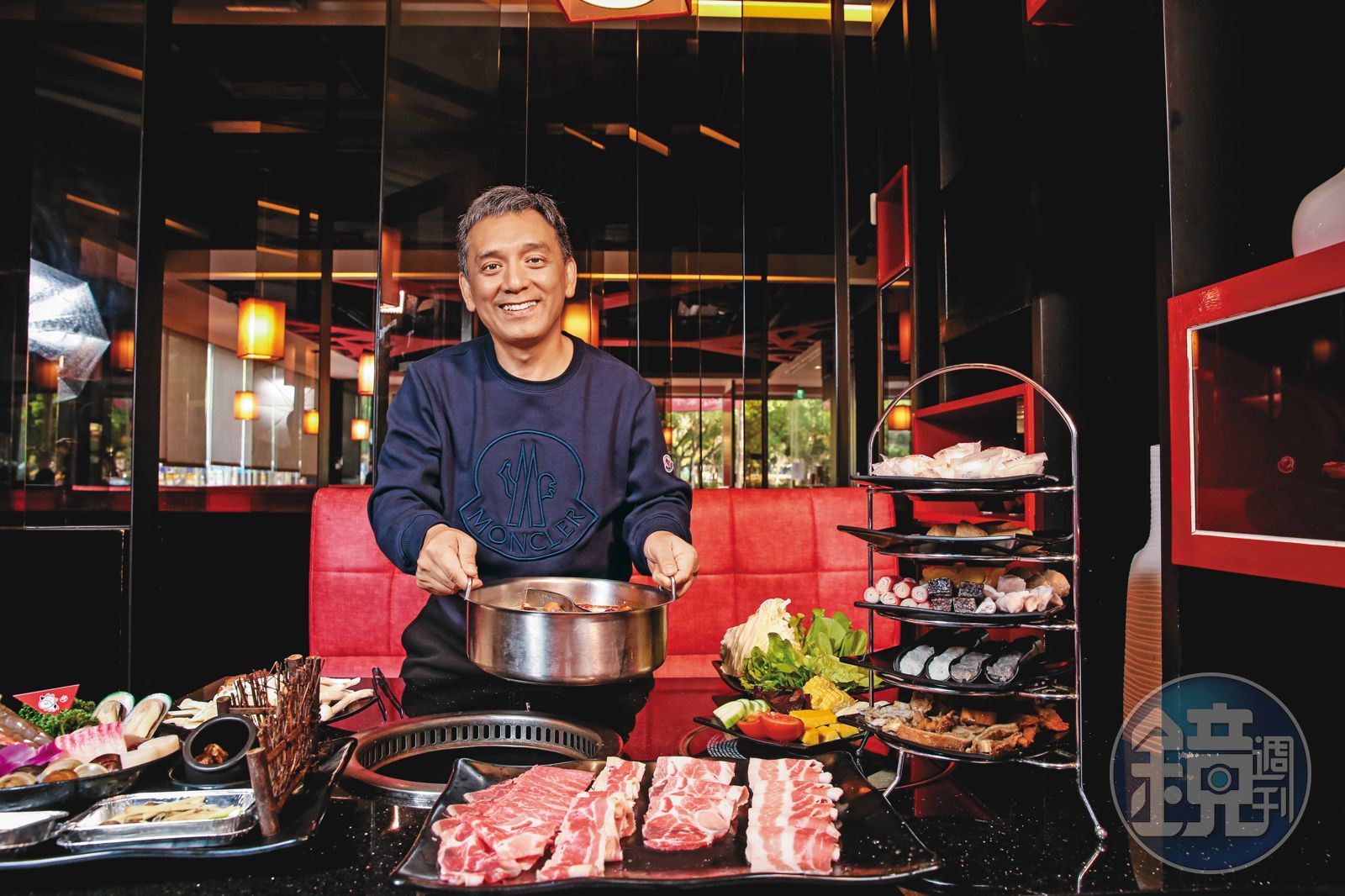 把一大片油花分布均勻的梅花豬肉,擺進沸騰而散發醇厚香氣的蒙古鍋內,接著再把肥美牛五花放上鋪著烤盤紙的電烤爐,小蒙牛餐飲集團總經理高溢男熟練地幫肉片翻身,「吃吃看我們的肉,保證好吃。」他用沙啞的聲音頻掛保證,「牛肉有Prime等級霜降、和牛,豬都用台灣溫體豬,牠們從小就被閹掉,比較沒有騷味。」送入口,豬肉鮮甜不腥、牛肉軟嫩多汁,瞥見顧客滿足神情,他得意形於色,接著又端出天使紅蝦、草蝦、干貝等各種海鮮。