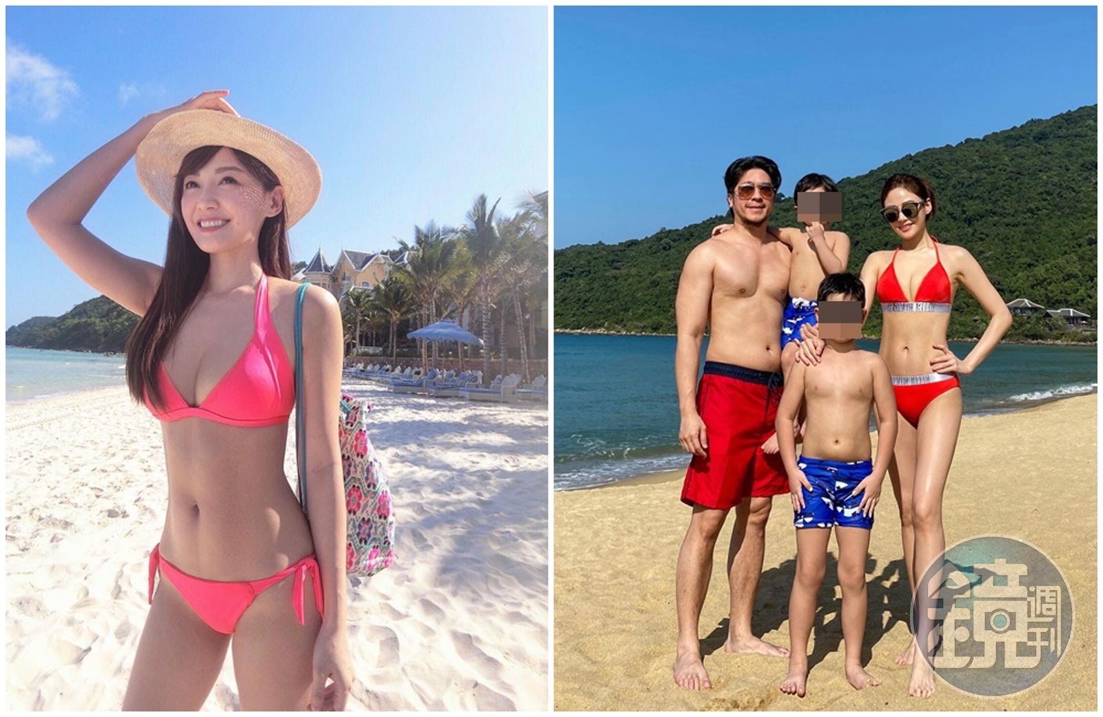 曾擔任TVBS主播,之後轉型藝人的王怡仁,2012年與鞋業小開張育翰閃婚,肓有二子一女的她,今(14日)在臉書大晒與老公兩個兒子在越南的渡假照,39歲的她更穿上火紅色比堅尼,露出苦練多年的馬甲線,身材火辣絕對不像三寶媽。