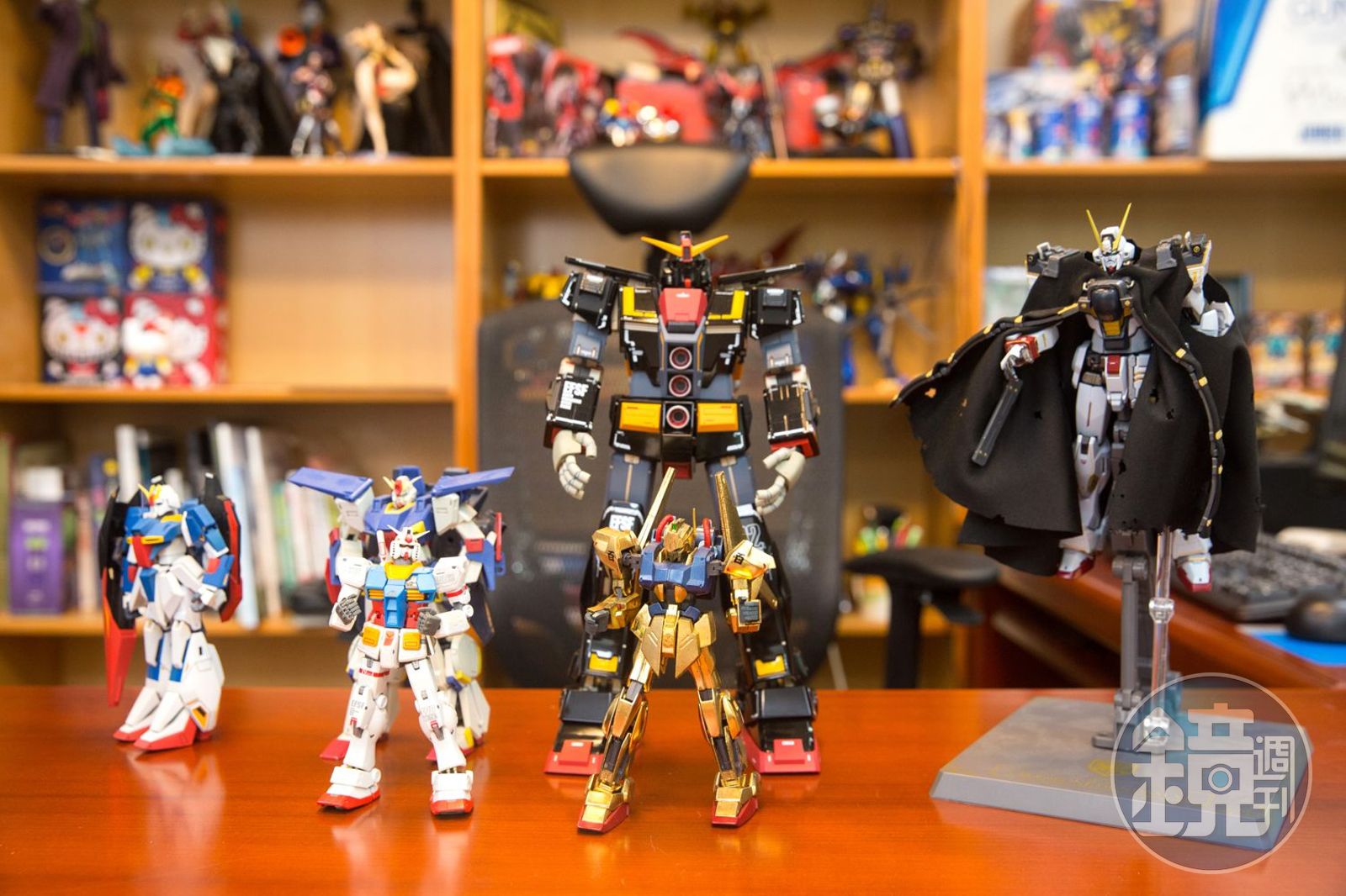 只是鄭運鵬這一買,彷彿開關被打開了一樣,他到台北車站後站的玩具街買,上網去標,透過各種管道收玩具。而且因為忙碌,他也很少買一般俗稱「鋼普拉(GUNPLA)」、需要每個零件細細組裝的鋼彈塑膠模型。「你買了之後都會誤會自己會做,其實根本不會做。」他又喜歡關節可動性高的,「手指會動就受不了」,所以現在都收組裝簡單、合金系列的鋼彈較多,「組好的一定貴啊!越買單價越高。」