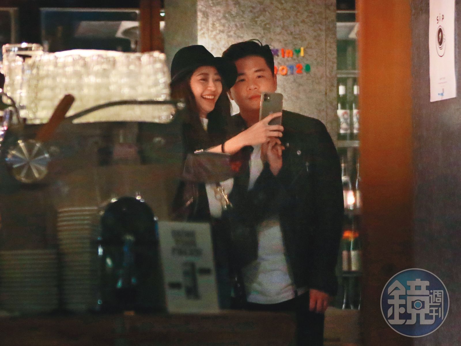 2/12 22:30,兩人吃飽喝足後走出餐廳,陳育涵滿臉甜蜜笑容在門口和皮衣男玩自拍。發布時間:2020.02.19 06:28 臺北時間