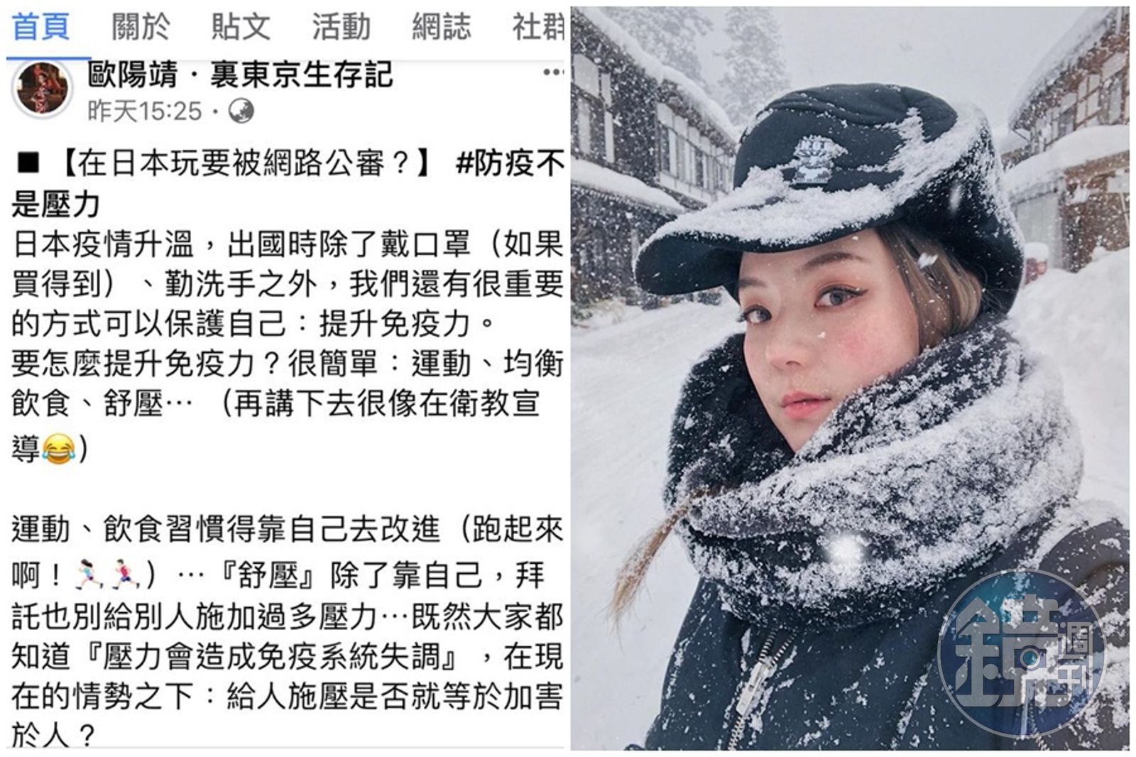 歐陽靖表示,最近有朋友在臉書PO了幾張跟家人去熊本玩的照片,過10分鐘後發現底下留言暴增,沒想到大家不是說「哇!好漂亮!好羨慕!」而是說「你怎麼可以不戴口罩?」「你怎麼敢出門玩?」「你回台灣小心被隔離!」