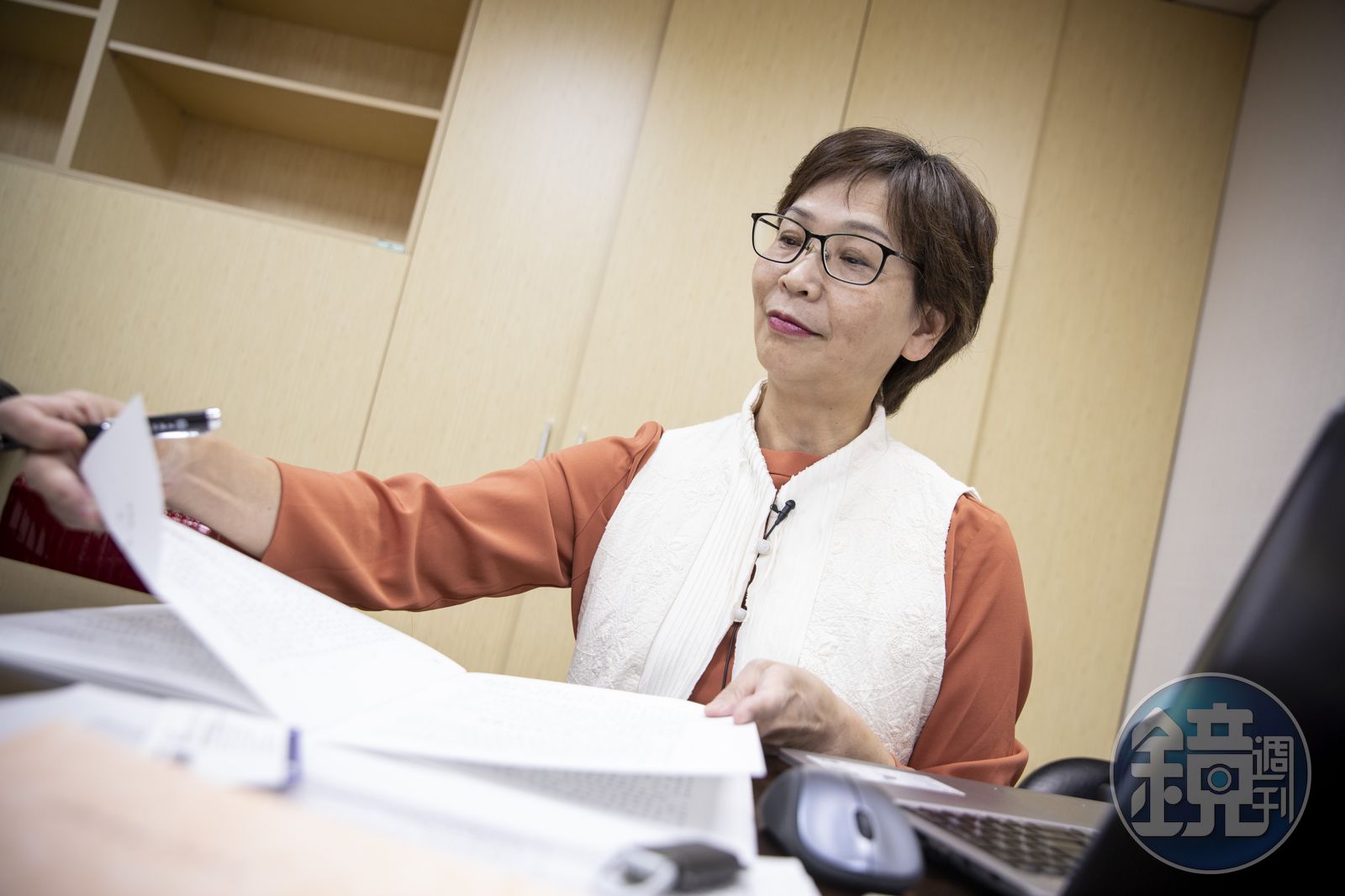 她辦公室書架上,目前只有一排書,有醫療、環保、立委相關教科書等,除了幾本政治人物傳記,大多是實用的工具書。我們請她坐在辦公桌前拍照,她立刻翻開一本《行政院施政報告》說:「我最近很認真把施政報告念完,我的幕僚很慘,我會劃線,叫他們查政府開放檔案,現在進度到哪了?」她指了指上頭的畫線與註記:「像這個促進青年返鄉,我要知道返鄉程度做到怎樣?這個開放政治檔案、落實政黨政治的公平競爭,我就會打個問號。」
