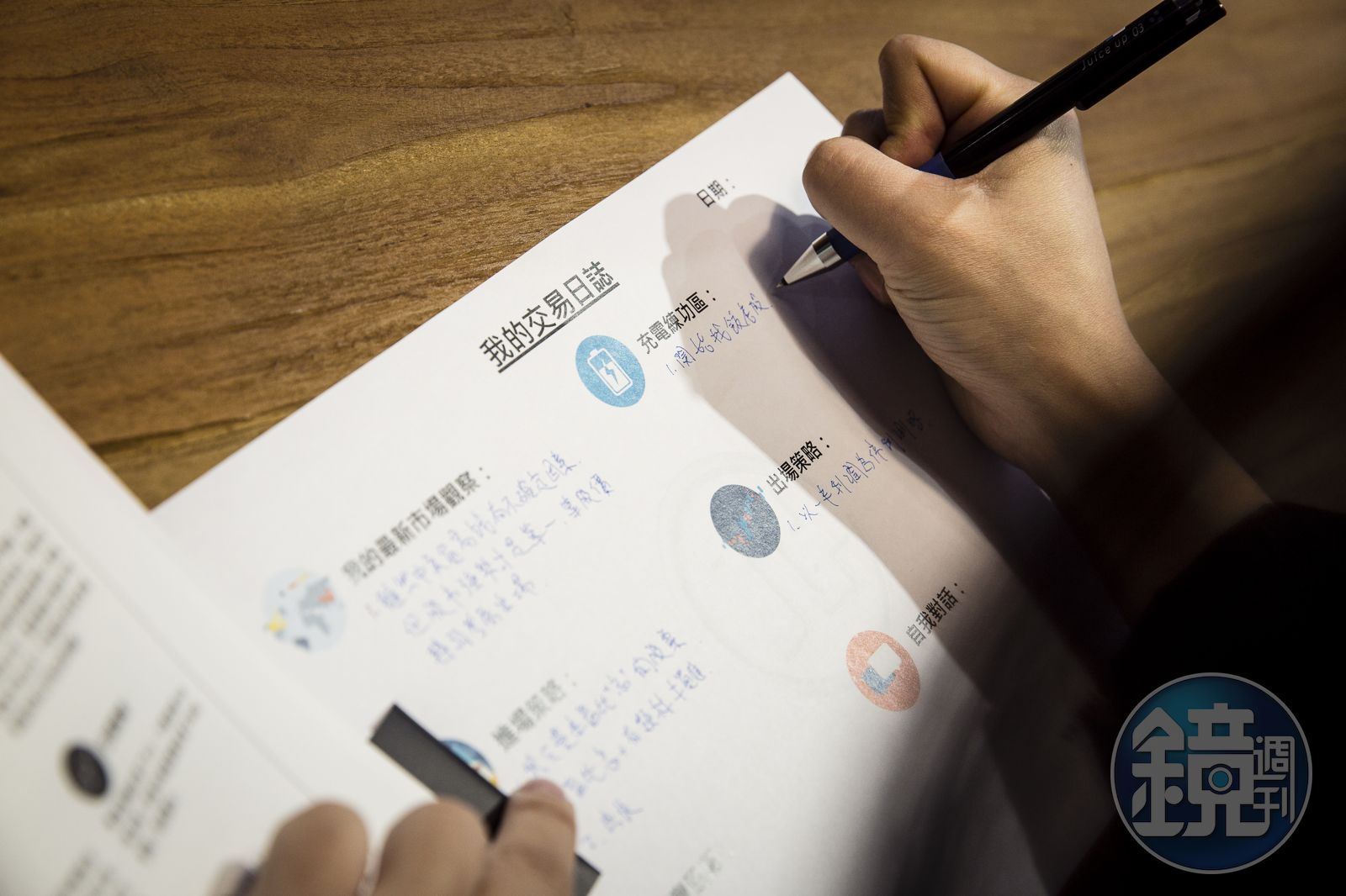 - 買賣回顧:若今天有進出場,就要寫下自己的買賣回顧,「我這次太急了,沒有在對的地方進場。原本設定好本益比8才要進場,結果8.8時你就進場,這些都要好好紀錄與檢討。」