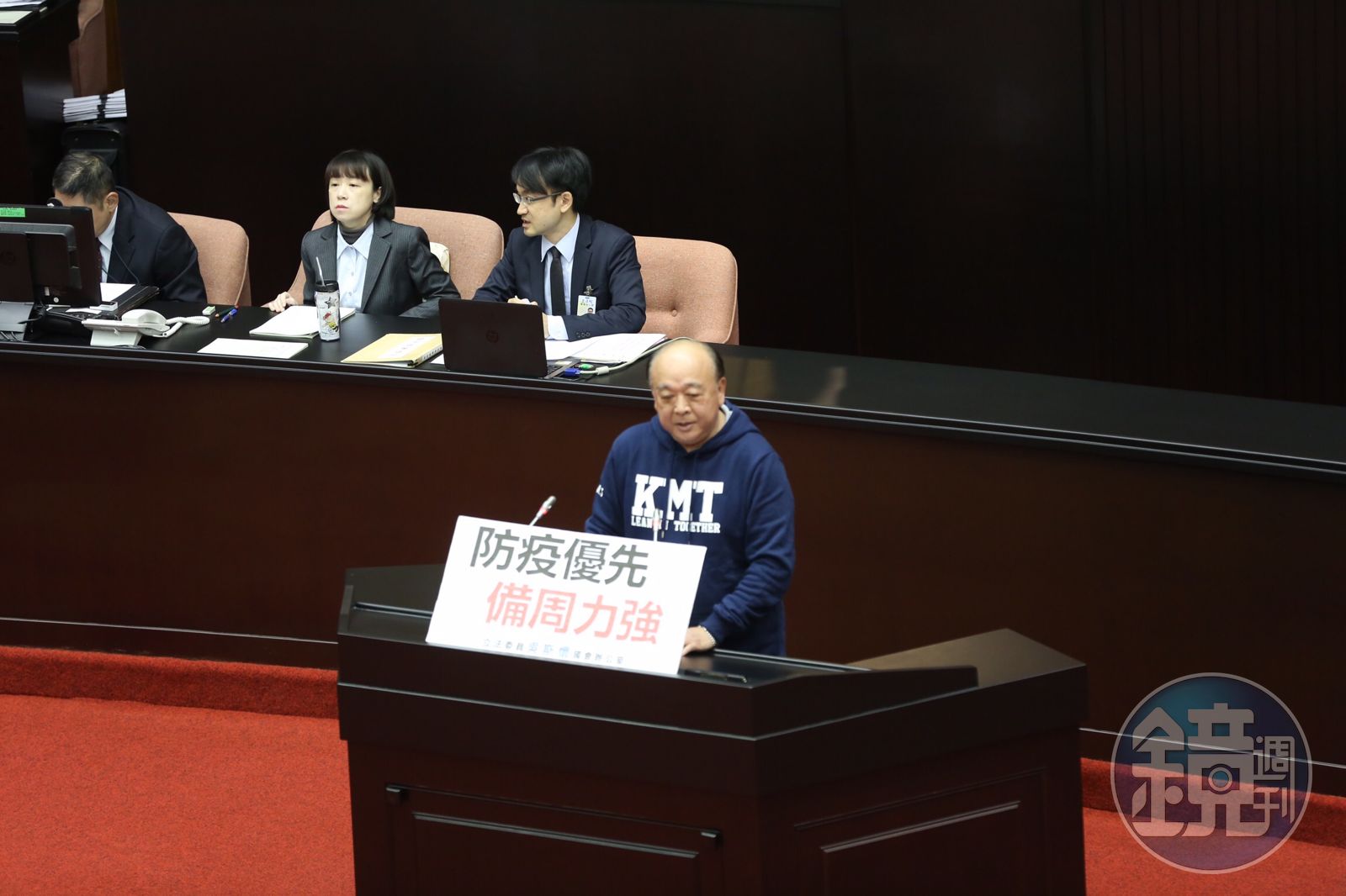 軍人出身的吳斯懷接著說:「站在專業立場,本席提醒蔡政府及國防部,現在韓國、新加坡、解放軍,都有軍人感染,如果發生在國軍,現在台澎金馬外島地區坑道、海空軍艦艇、雷達站,都是偏遠地區的密閉空間,是否有足夠防護能力,以及自我需求的醫療設施。」