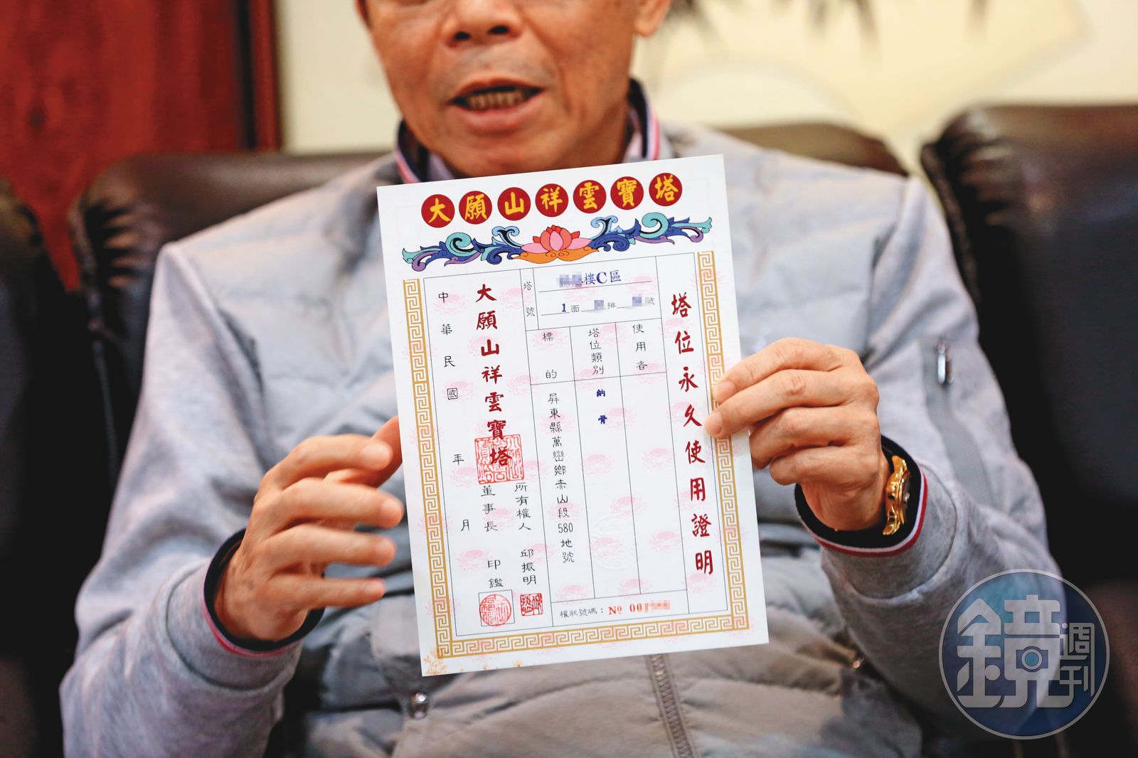 陳寶全向本刊投訴,中東寶塔原名福祿壽寶塔,1991年由邱振明起造,當時標榜高屏地區唯一遵照相關法令申請,並經核准使用的納骨塔。陳說,邱欠他2000萬元、用1000個塔位抵債,等於一個塔位2萬元,他因此取得塔位產權。