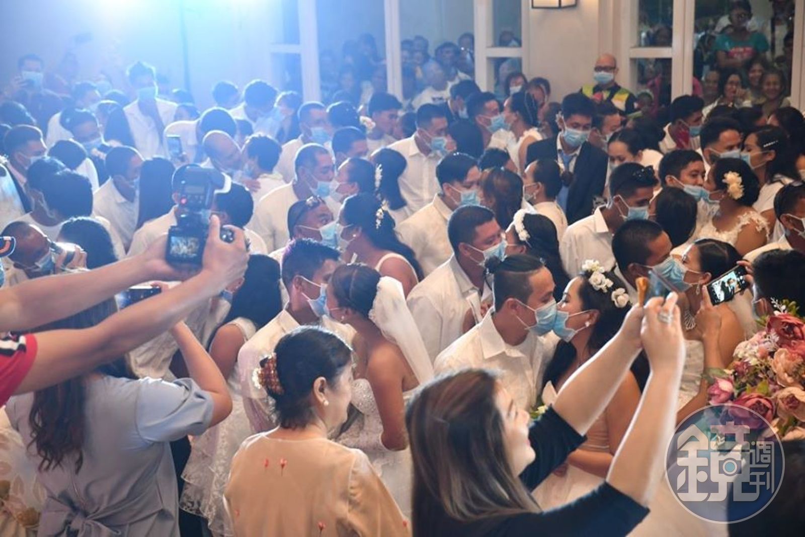 綜合外媒報導,上週四在菲律賓巴科羅市依照傳統舉辦聯合婚禮,並由市長主持儀式。為了防止疫情擴散,220對新人戴上主辦單位提供的藍色外科口罩,隔著口罩接吻互道結婚誓言。