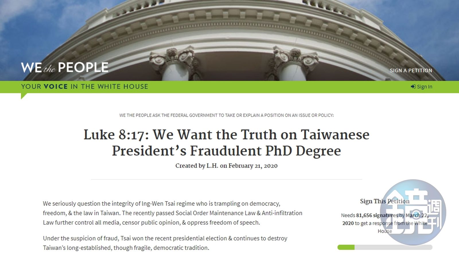 總統蔡英文去年選舉期間被質疑學歷造假,但蔡屢次釋疑,翻出三十多年前的博士論文向大眾公開,相關人士出面證實,就連英國政經學院(LSE)也多次發聲明掛保證蔡的學歷為真,許多反對者仍拒絕相信。近日白宮連署網站We the People甚至出現一個新的連署案,要求「蔡英文論文真相」,消息傳回台灣,許多網友相當傻眼:「我們是美國公民?」