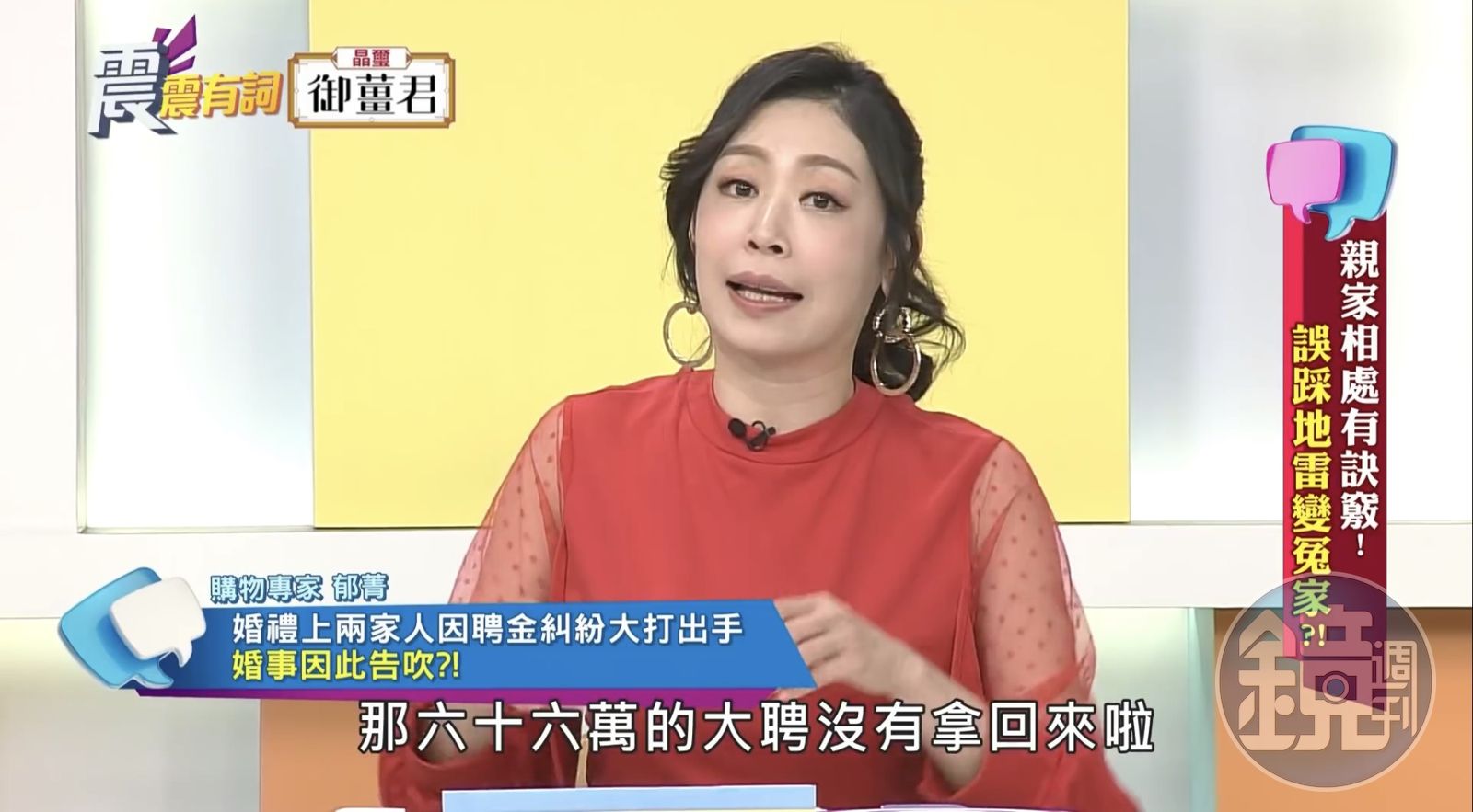 郁菁表示當天主持婚禮時就發現雙方家長不太對勁,可說是「相敬如冰」,等到她邀請男方家長上台致詞,誰知道喝到走路搖搖晃晃的家長開口竟是「我跟大家講,這個媳婦我是有喜歡,但是她66萬沒還我,這66萬我不要了,我就當作我買一隻母豬回來幫我生孩子!」此話一出,引來女方家長不爽衝上台爭執,並大打出手。最後新人、雙方家長通通離席,留下一堆錯愕的賓客繼續把喜宴吃完。